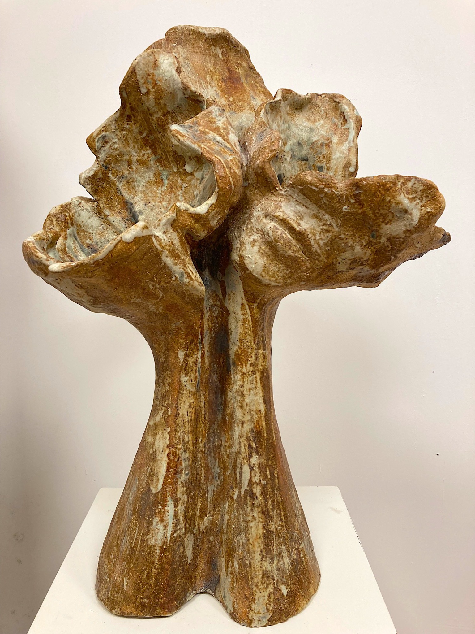 Beeld van klei, abstract. Natuur. Boomachtig vorm met onderdelen van gezichten. Het beeld is hooggestookt , d.w.z. het beeld kan buiten en binnen staan. Kleuren zwart, bruin, groen, beige, wit. Materiaal: Klei, glazuren, oxydes. Tegen meerprijs kan het beeld op een (bijv stenen) sokkel gemonteerd worden.