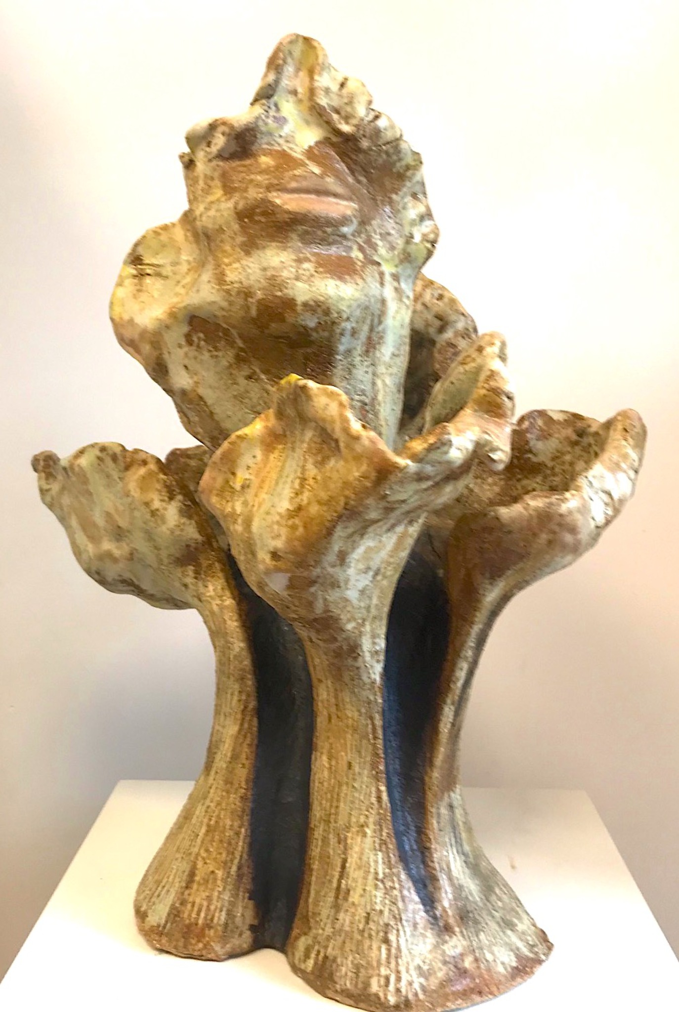 Beeld van klei, abstract. Natuur. Boomachtig vorm met onderdelen van gezichten. Het beeld is hooggestookt , d.w.z. het beeld kan buiten en binnen staan. Kleuren zwart, bruin, geel. Materiaal: Klei, glazuren, oxydes. Tegen meerprijs kan het beeld op een (bijv stenen) sokkel gemonteerd worden.