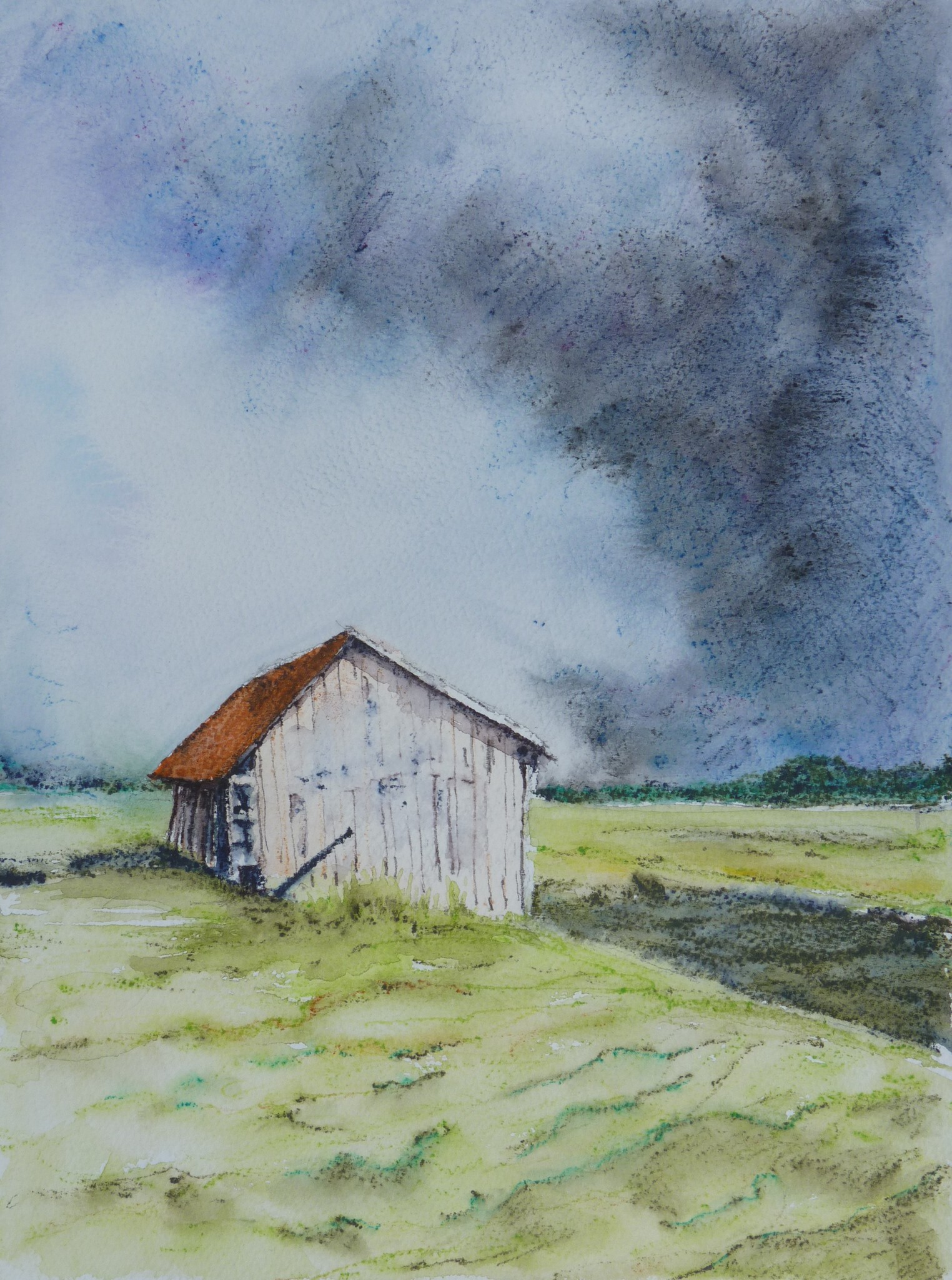 De storm komt eraan. Een Noorse schuur staat nog in het felle licht. Geschilderd met Inktense pencils en wassingen.