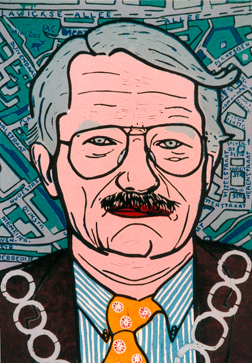Portret van Michel Jager, ex-burgemeester van Wageningen Linosnede 50 x 70 cm