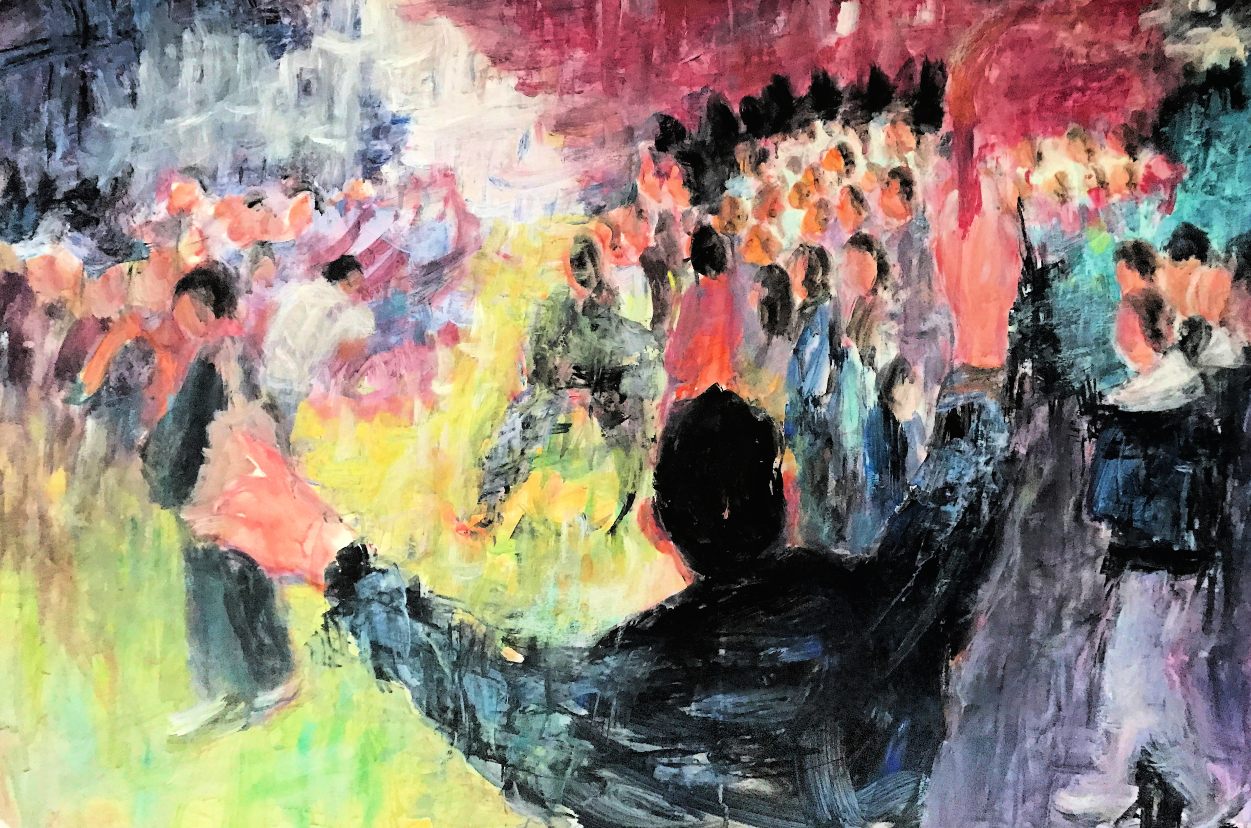 Een vreugdevol lichtgevend beeld van saamhorigheid met één jonge figuur met brandende fakkels op de voorgrond, die de vreugde lijkt te orkestreren en bij elkaar te houden: een wensbeeld voor 2022.