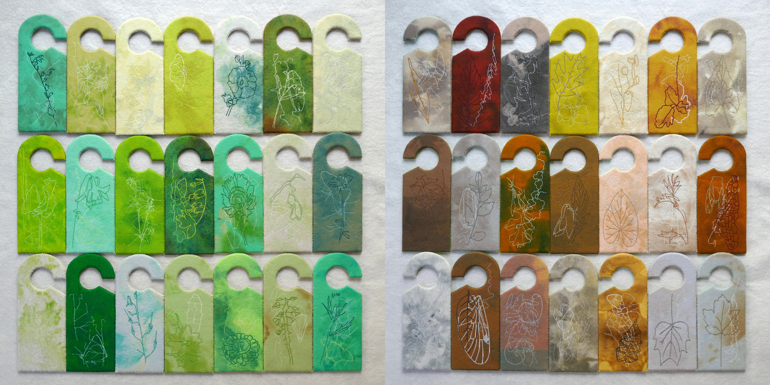 serie (190 stuks) 2-zijdig met handgeverfd vilt geborduurde deurhangers; 100% wol vilt, mat garen, glansgaren, glow-in-the-dark garen, boduurgaren, hout. De werken zijn per stuk te koop.