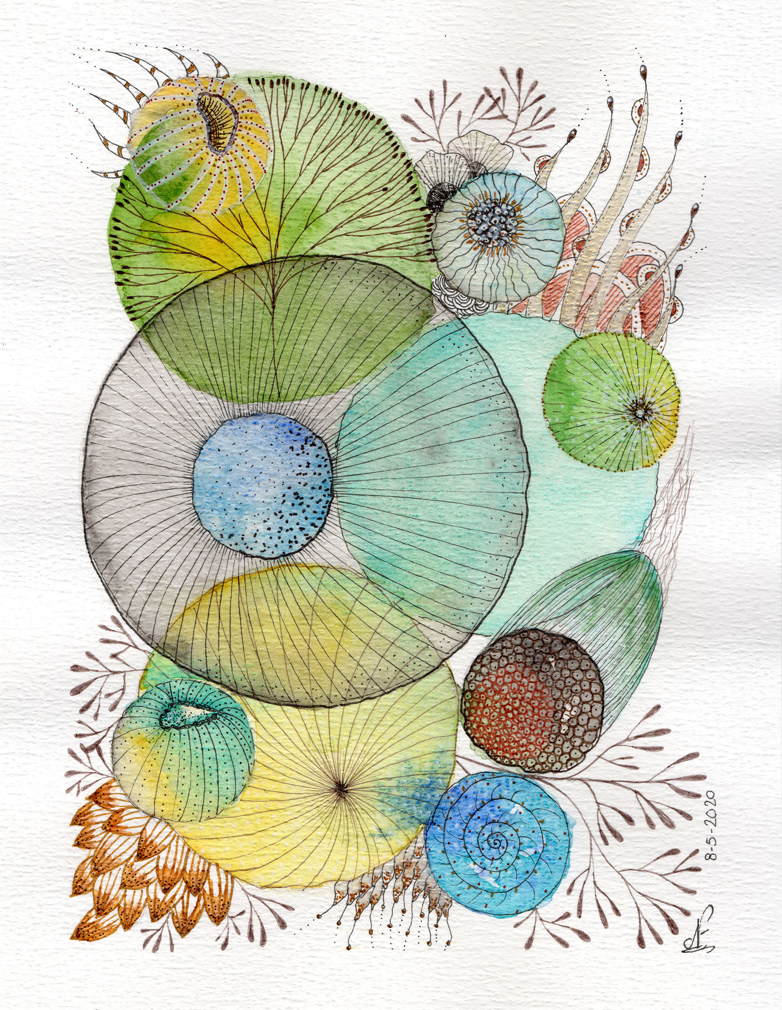 Aquarel met mixed media. Een intuitief, collageachtig werk geïnspireerd door het onderwaterleven in de oceaan.