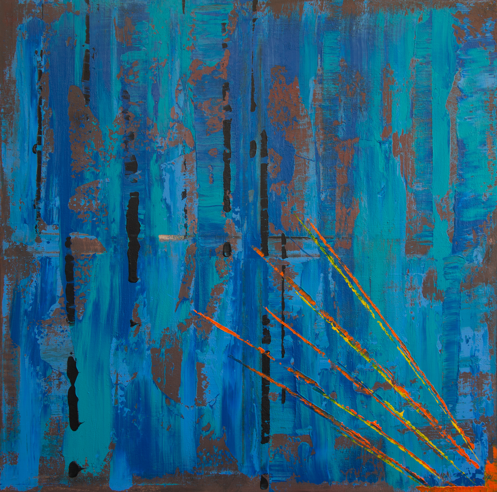 blauw abstract werk met oranje/geel accent waarbij de acrylverf met een spatel is aangebracht.