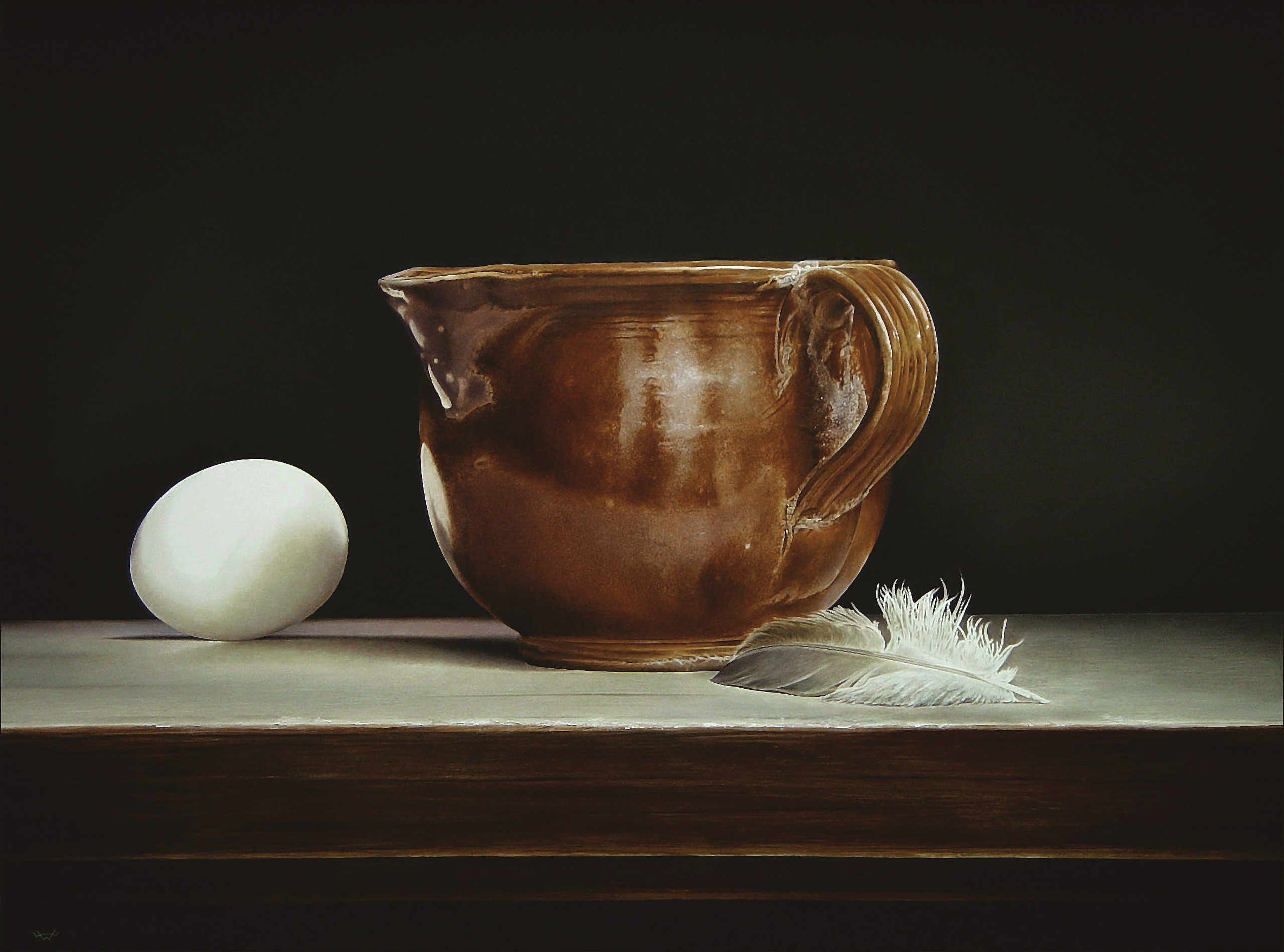 Stilleven met kom en veertje. Verkoop Galerie Lieve Hemel.