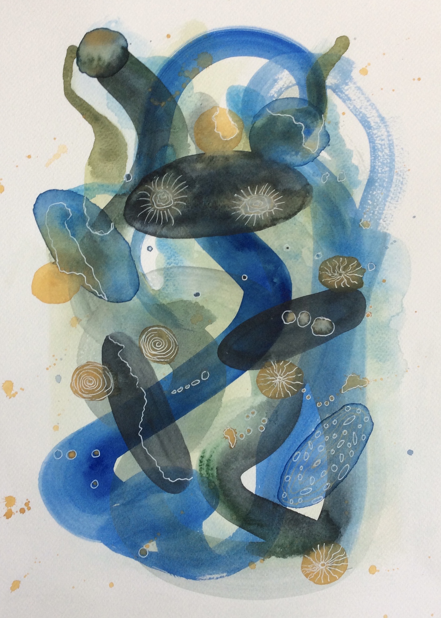 Vormen in aquarel werkend vanuit mijn fantasie en geïnspireerd door de natuur, kleuren en bewegingen om mij heen.