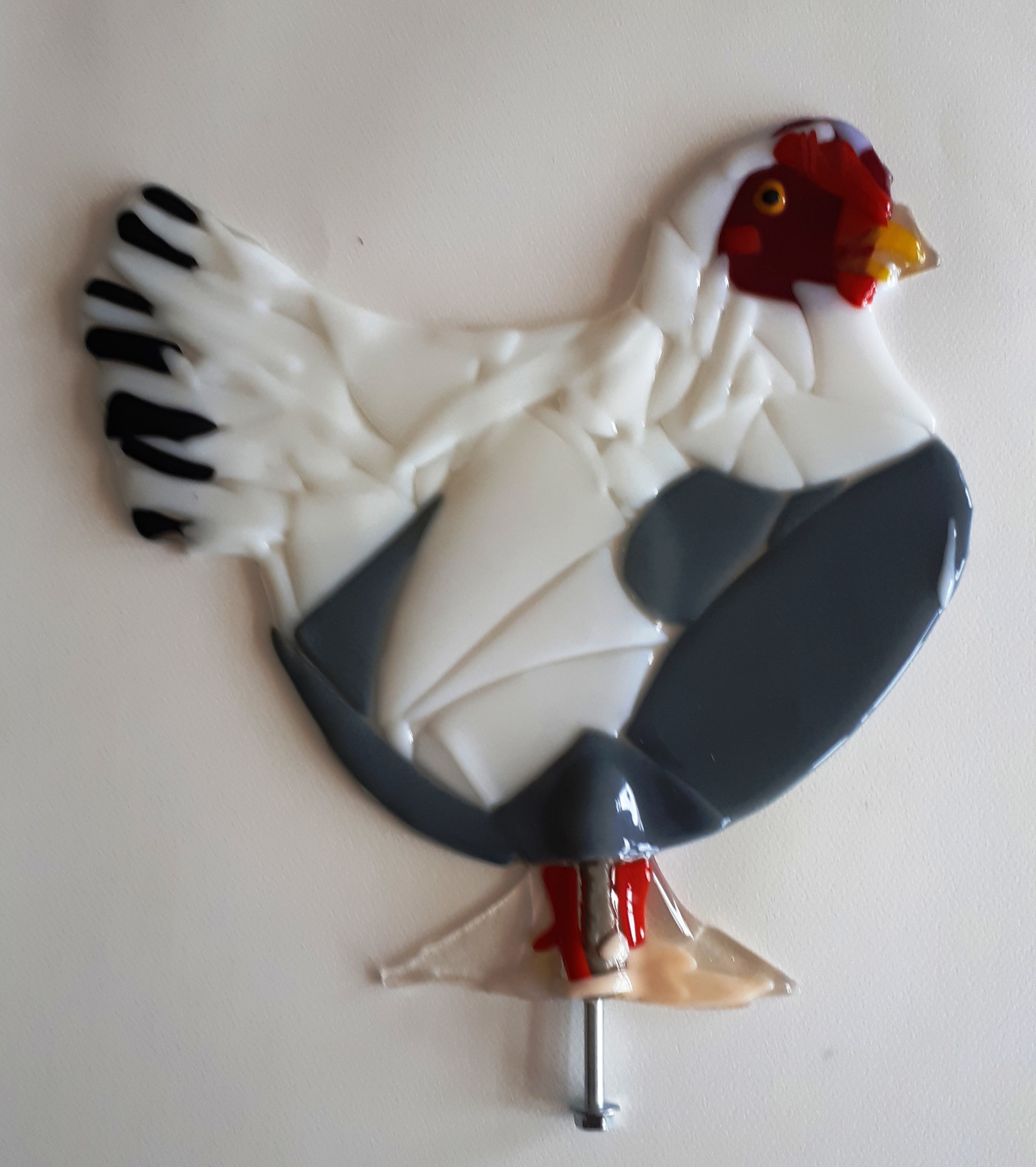 In de kippentraktor van Kunstwandelroute Hackfort 2024 staan een haan en 3 kippen van glas. Witte kip naar rechts kijkend gemodelleerd naar onze kip Bianca. Bullseyeglass glassfusion. In wit, grijs opaak glas.Kan buiten opgesteld worden.