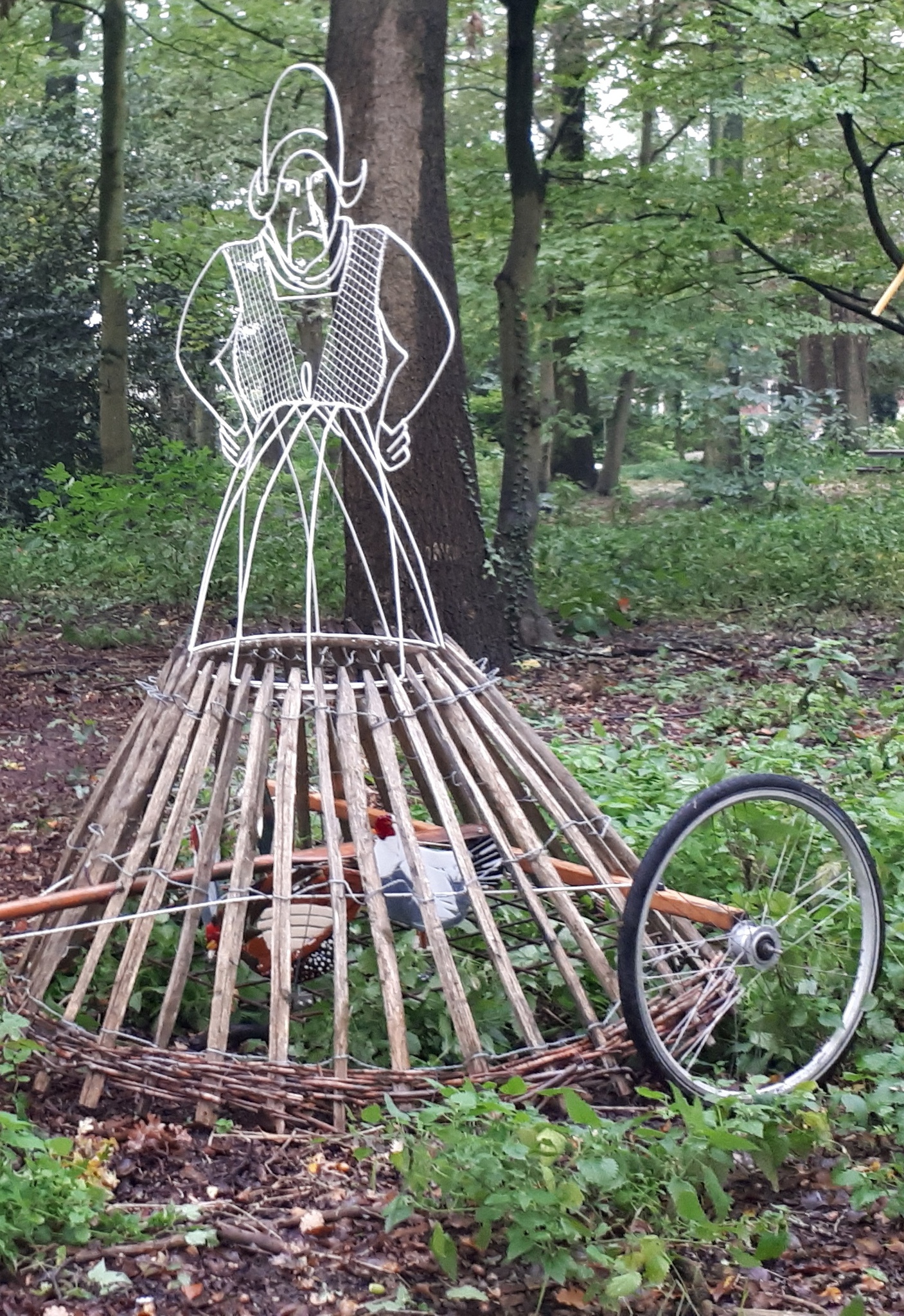 Kippentractor, installatie tijdens Kunstwandelroute Hackfort 700 jaar, klaar voor de klimaatverandering. Open van 15 juni t/m 29 september 2024. Route van 1,5 km langs 7 kunstwerken van 7 regionale kunstenaars. (hout, metaal en glas. Omarm in natuurinclusieve landbouw ook de bewezen methodes van vóór 1950) Opoe heeft een gaatje in haar kop Dat ploegen heeft toch geen zin Laat de kippen de grond openen en zoeken naar aalt, emelt en engerling Ik zie in gedachten het boerinnetje met haar schort Hoe ze voor haar kippen zorgde Zo lang geleden en toch zo kort Telkens de kippentractor verzettend met water, wat bijvoer en avondstok Laat de kippen toch het werk doen Intens gelukkig in hun wand’lend hok in de krant klik hier.