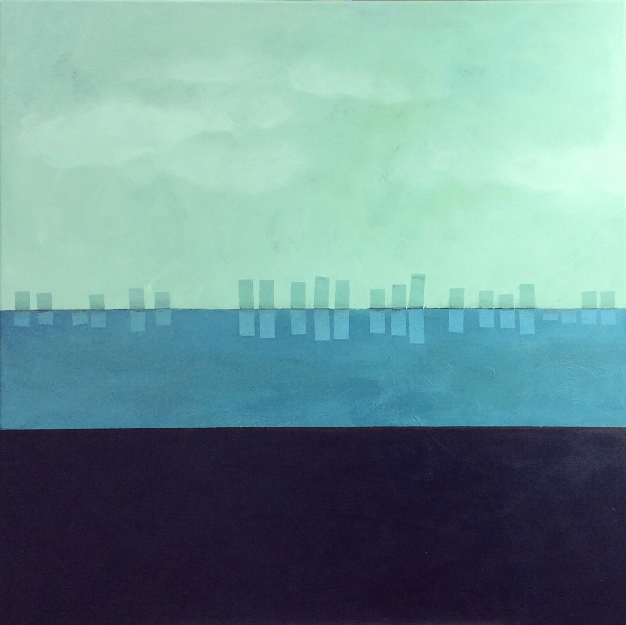 Is het een landschap? Met meerpalen, of met gebouwen in de verte? Dit bedoel ik met figuratief abstract: je kunt, en mag, er van alles in zien!