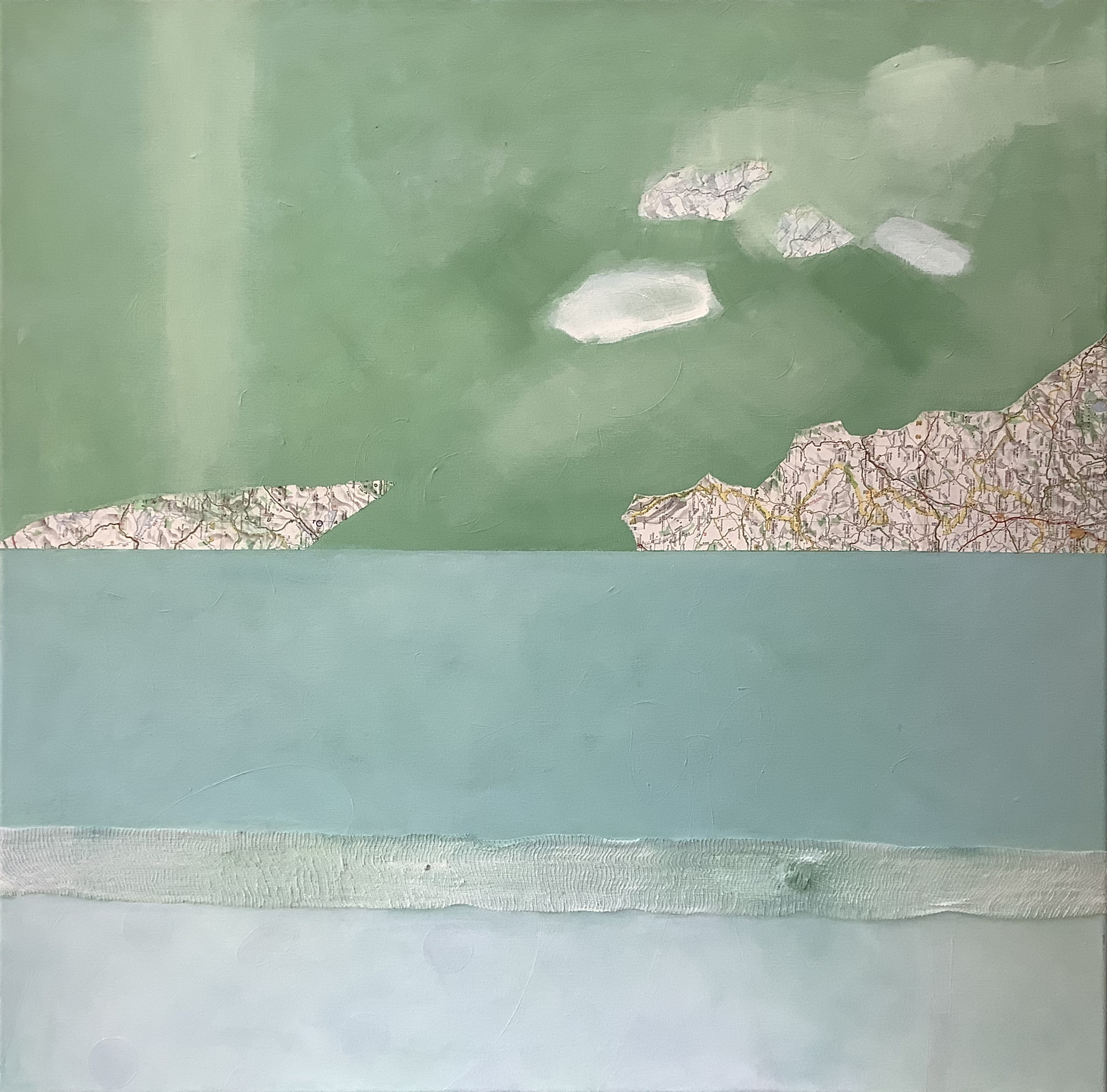 Dit is een fictief landschap. Ik heb er rekverband en stukjes landkaart op bevestigd. Dat geeft een mooi vervreemdend en toch herkenbaar beeld.