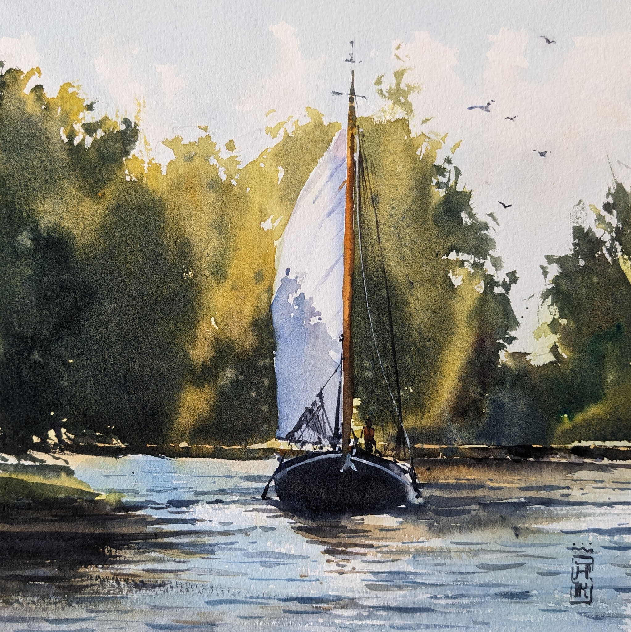 Zeilboot Schip Boot Realistische Aquarel Friesland Schilderij Sail Boat Painting Saescape Zomer Summer Watercolor