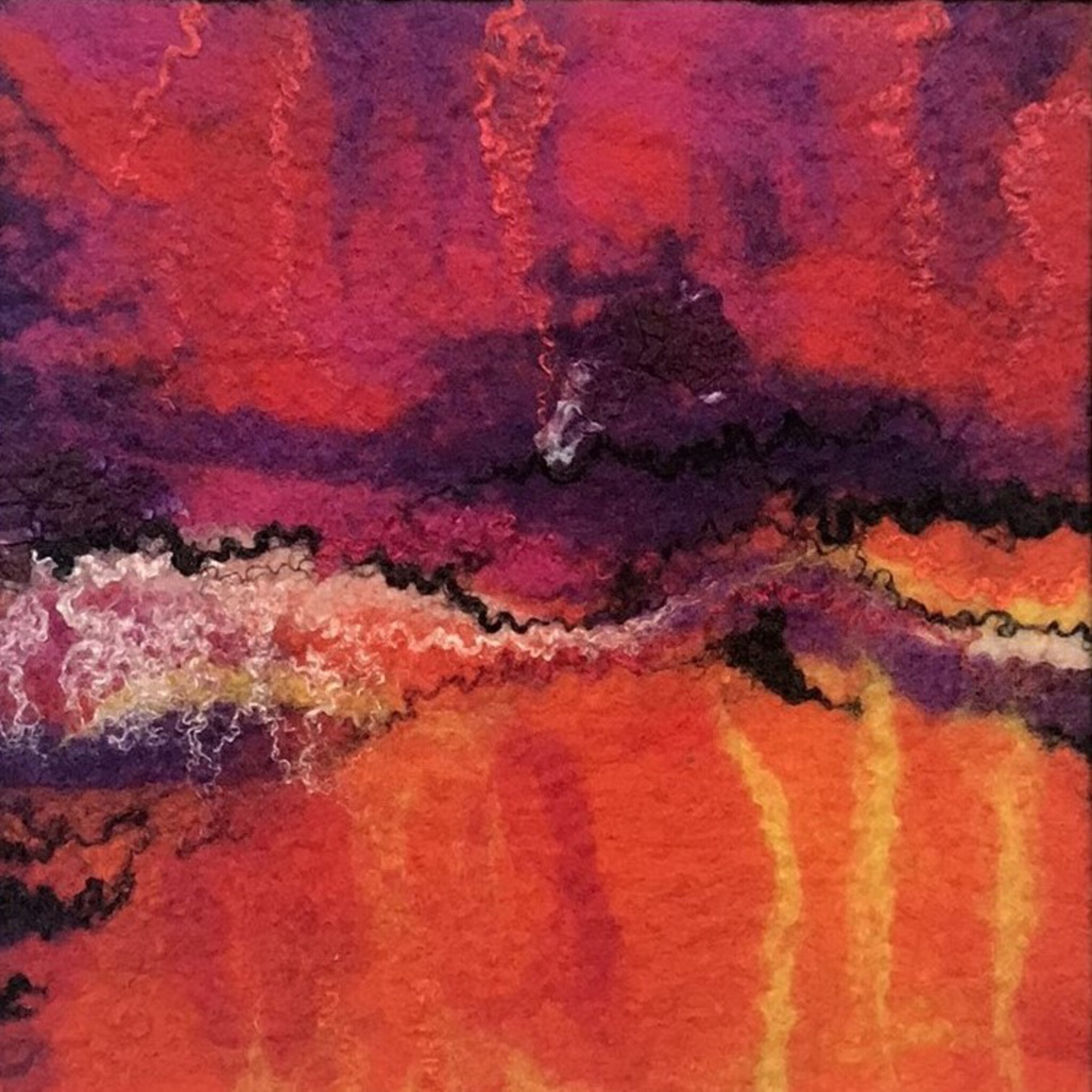 Handgevilte wol en zijde 20x20 cm. Zwart ingelijst incl. passepartout 30x30 cm.