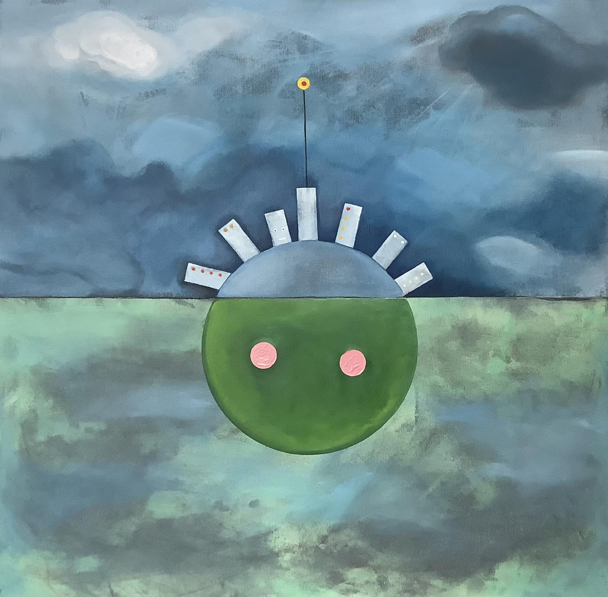 Ik noem deze stijl figuratief abstract. Het stelt niet iets voor wat je realistisch zou kunnen noemen, maar het roept wel allerlei associaties op. Is het een alien? Een onderzeemijn? Een spionagemiddel? Wat doet die antenne daar? Zie je wel? Er gebeuren allerlei dingen ondergronds… Een actueel onderwerp in deze tijd van complottheorieën en fake news!