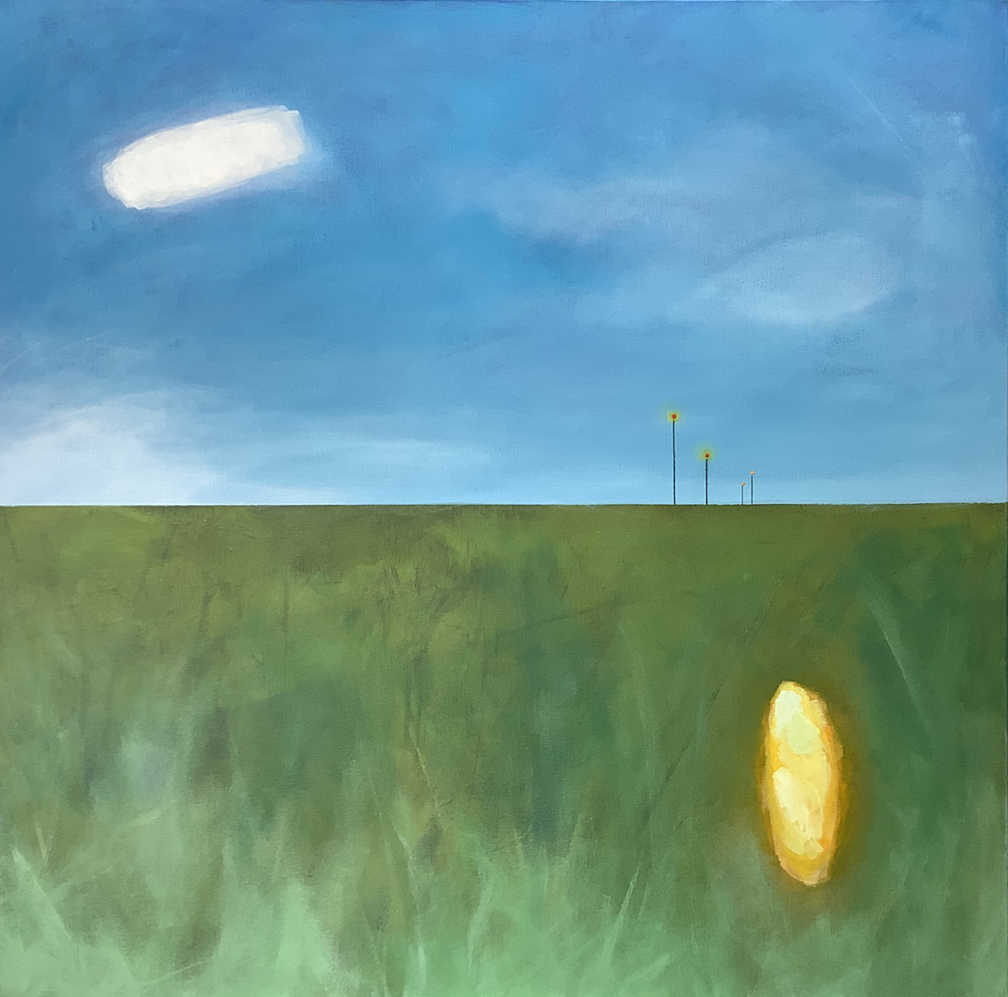 Ik noem deze stijl figuratief abstract. Het stelt niet iets voor wat je realistisch zou kunnen noemen, maar het roept wel allerlei associaties op. De inspiratie voor dit schilderij was eenvoudig: ik zag onderweg groene velden met een strakblauwe lucht, met in het veld 1 knalgele bremstruik en in de lucht 1 witte wolk.
