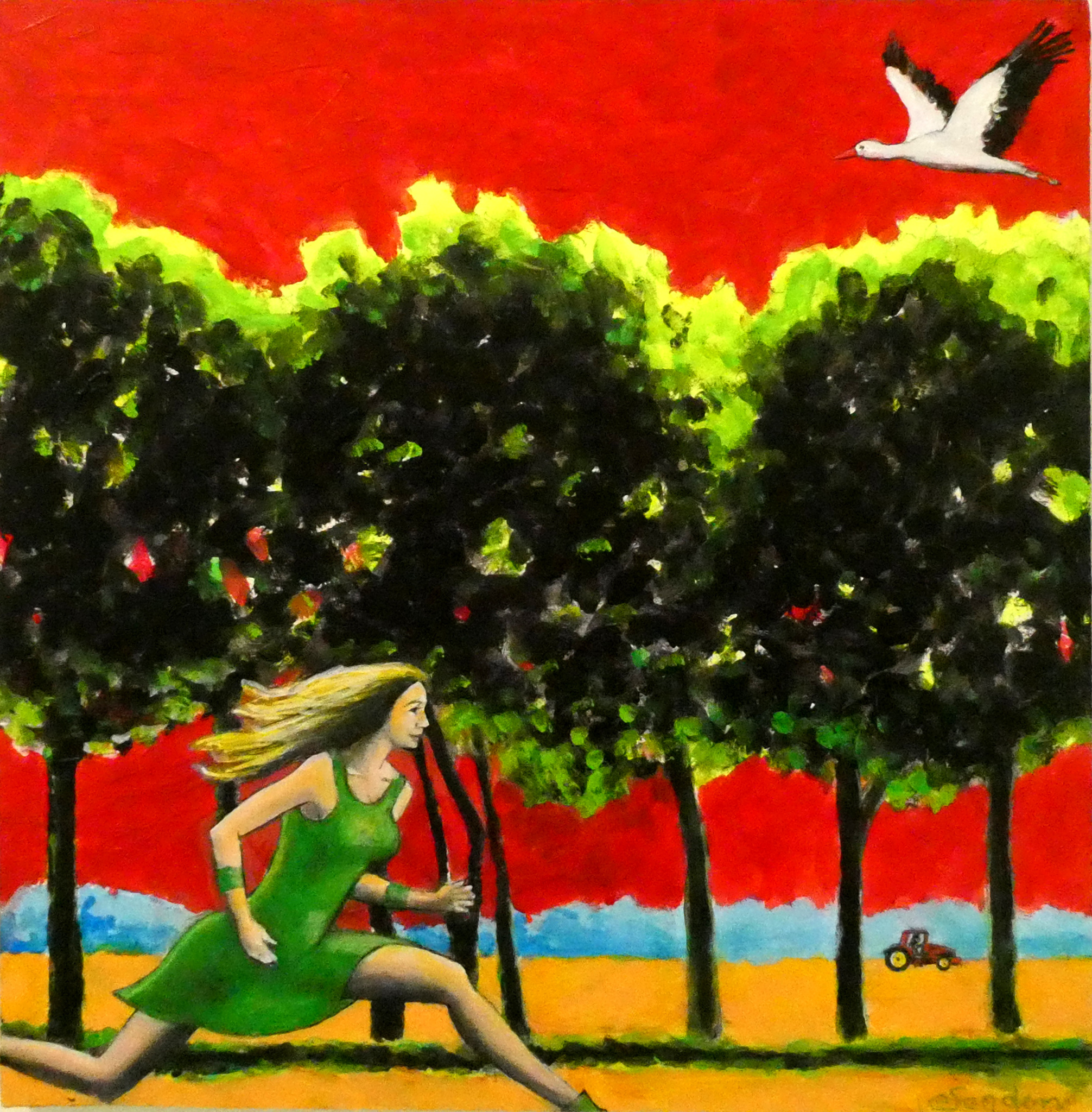 Gronings landschap met bomenrij en hardlopende vrouw. Daarboven vliegt een ooievaar. Op de achtergrond zien we een tractor. In sterke kleuren die de energie van het land uitdrukken.