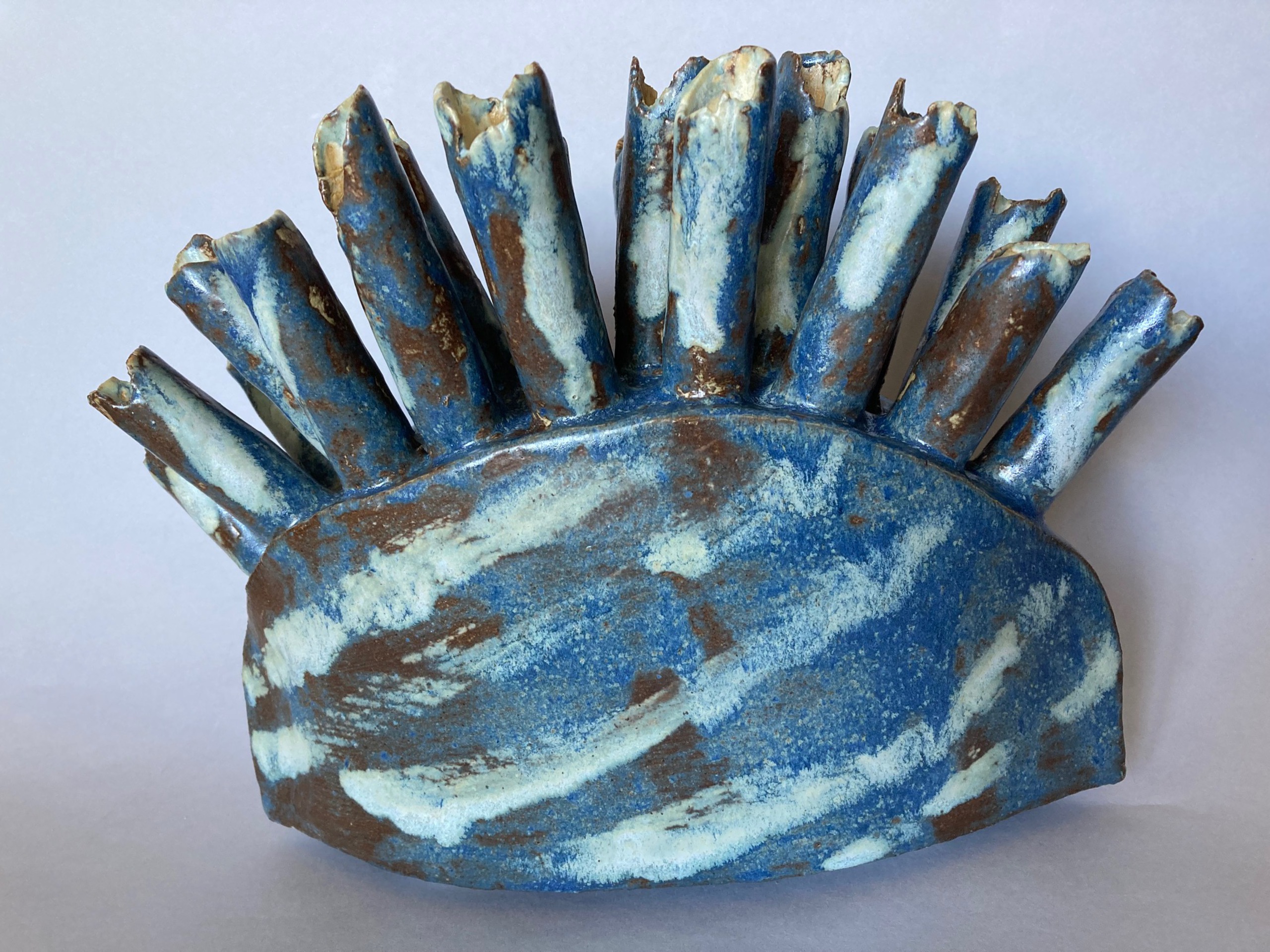 Vaas voor 21 bloemen; verschillende glazuren gestookt op 1250 graden.