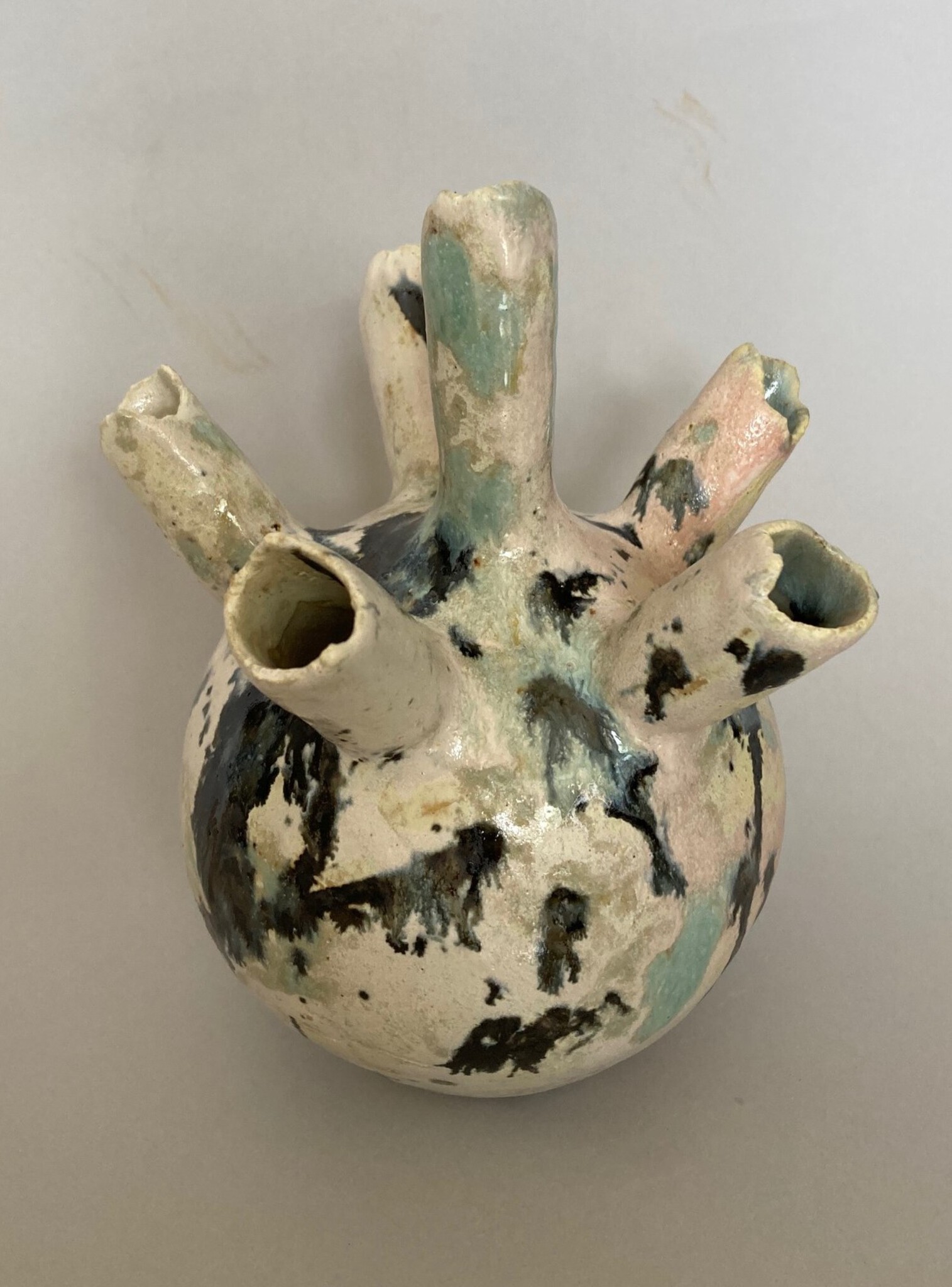 De objecten die ik maak zijn handgevormd. Ze zijn vooral bedoeld om naar te kijken, niet om te gebruiken. Ik hou van de huid van de klei en laat die graag zien. Door niet altijd het hele oppervlak te glazuren blijft het ruige uiterlijk van het materiaal zichtbaar. De laatste jaren heb ik veel met asglazuur gewerkt. Die as is steeds anders van samenstelling, waardoor het glazuur een grote mate van onvoorspelbaarheid heeft. Dat houdt het spannend.