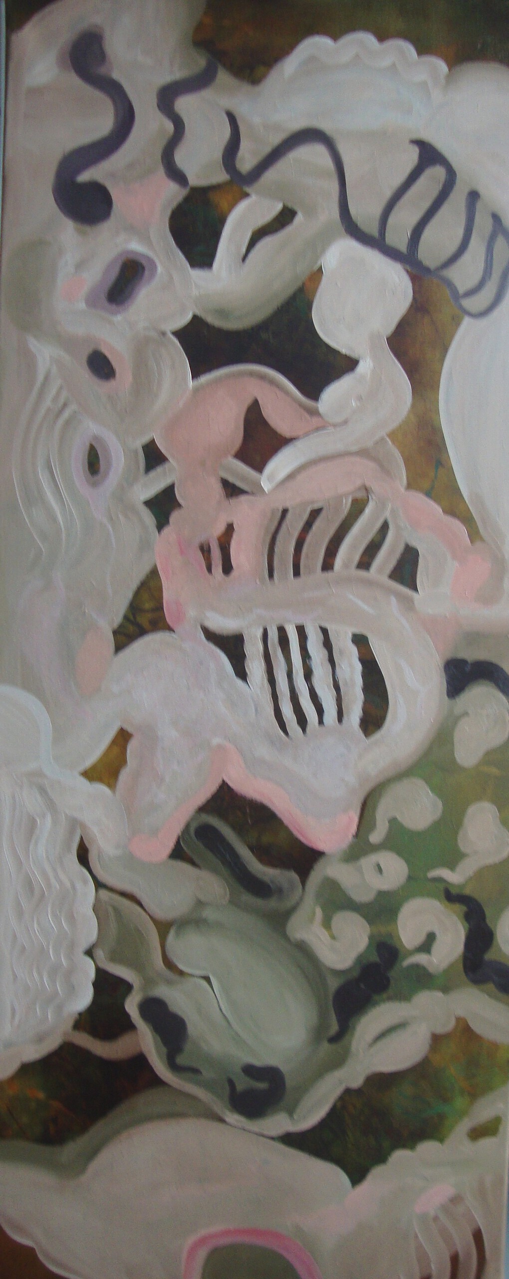 Organische en botanische vormen uit de natuur met dier embryo's . Groot langwerpig schilderij. Op Belgisch linnen. Zijkanten geschilderd. Voorzien van een mat vernis.