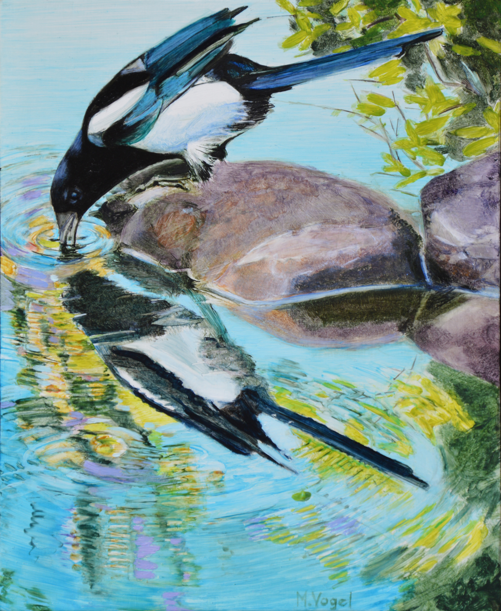 Strand Zwart Blauw Vogel Blue Water Kleurrijk Oil Olieverf Natuur Black Beach Bird Paint Stenen Bad Ekster Nature Colourful Paar Couple Bath Magpie