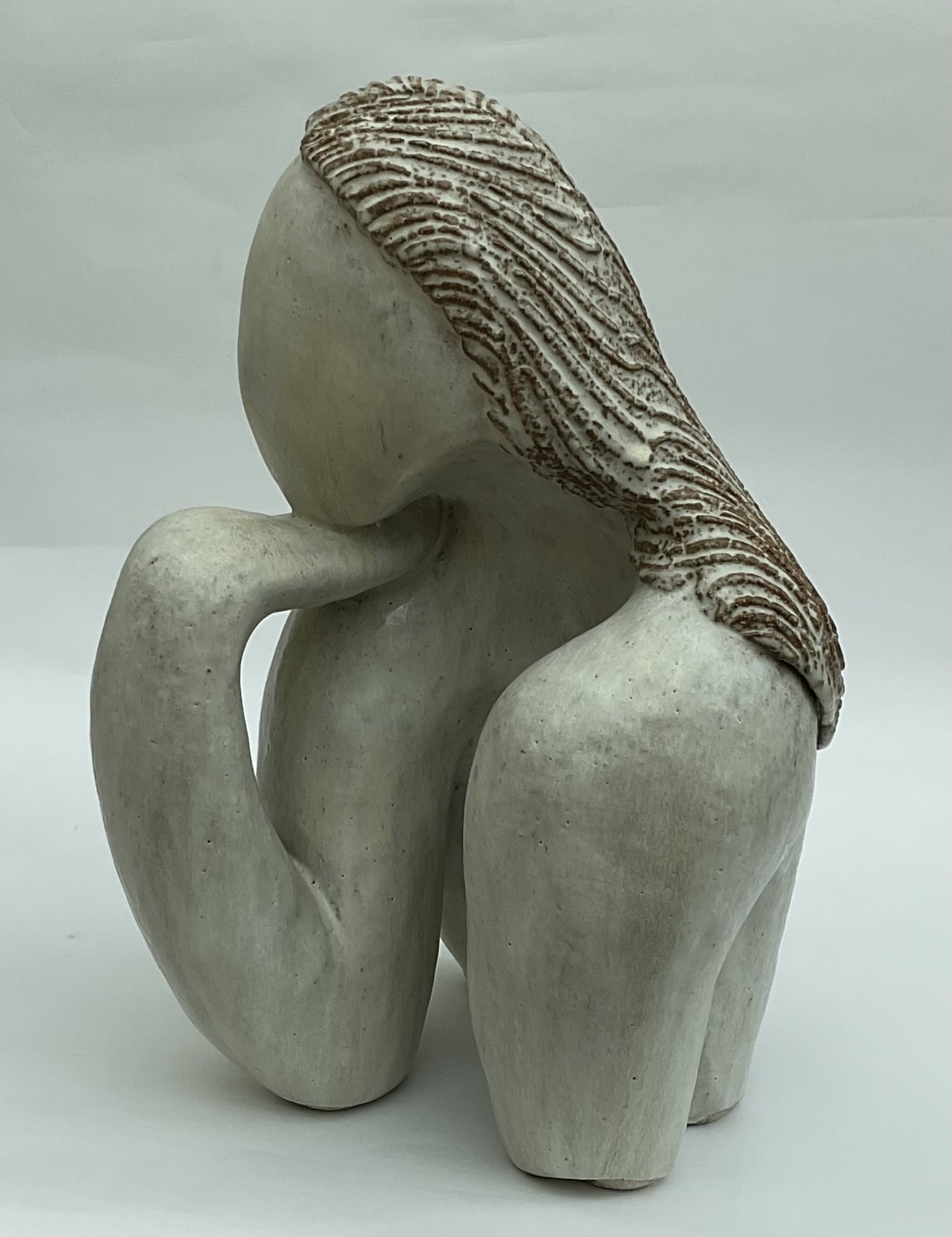 Zoektocht in keramiek: vrouwzijn in vloeiende lijnen en contouren; hoge dunne vaasvormen als weerspiegeling van een zoektocht naar identiteit...