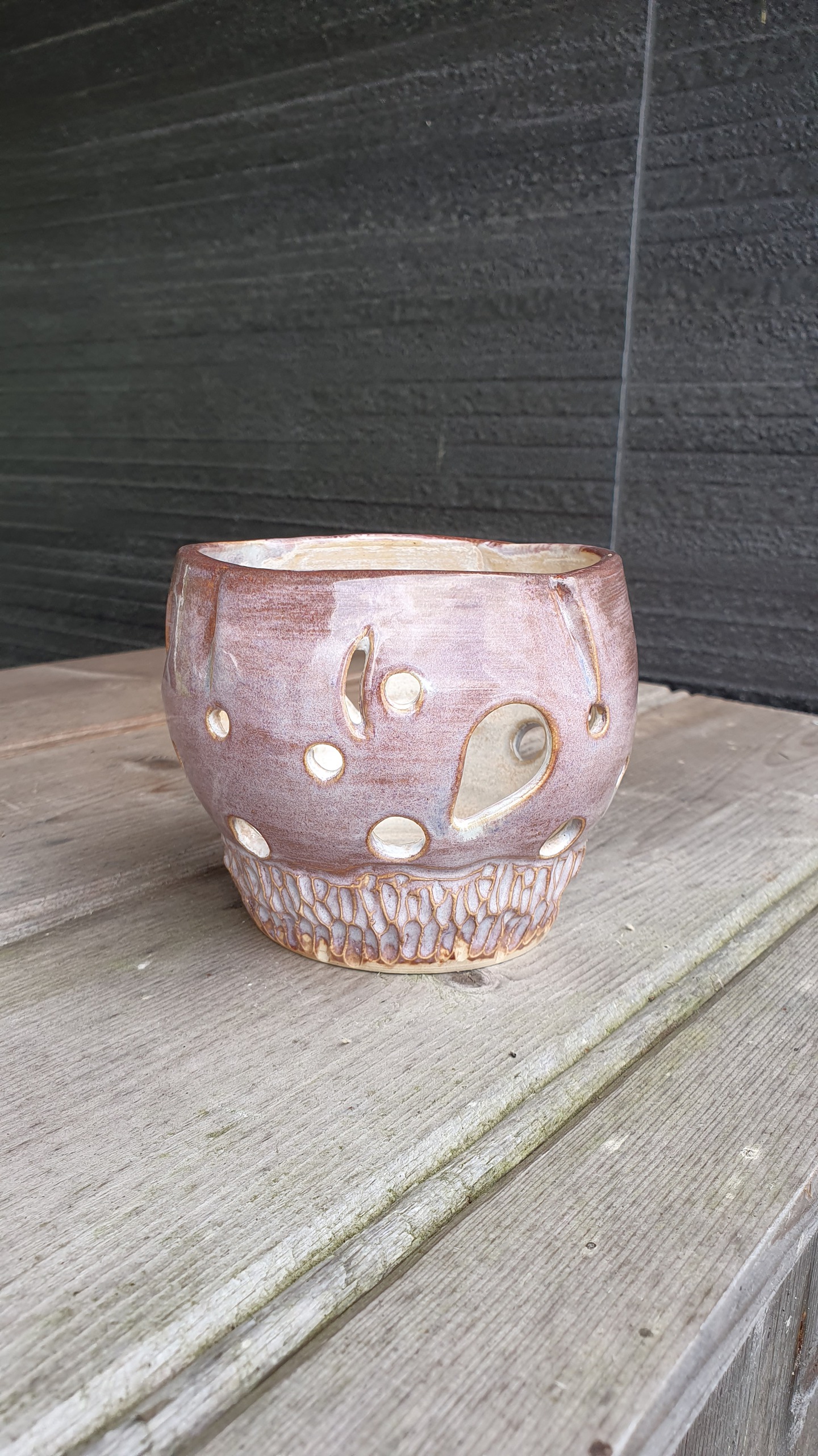 keramieken waxinelichthouder , steengoed, kleur: lila, kan binnen en buiten, gedraaid, uitgekerfd en met hand verder afgewerkt.