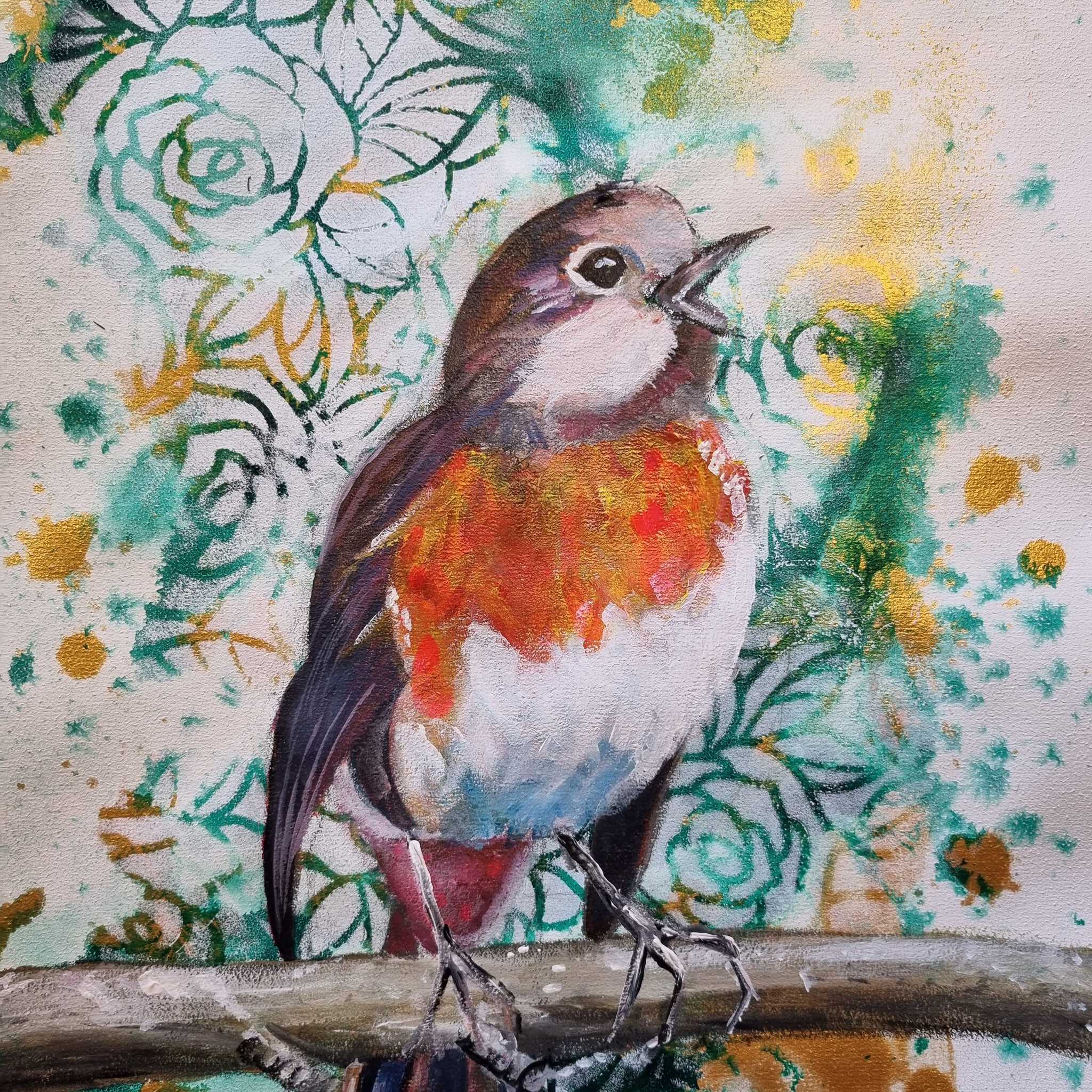 Vogeltje met acrylverf en inkten. Hierbij gebruik gemaakt van sjablonen.