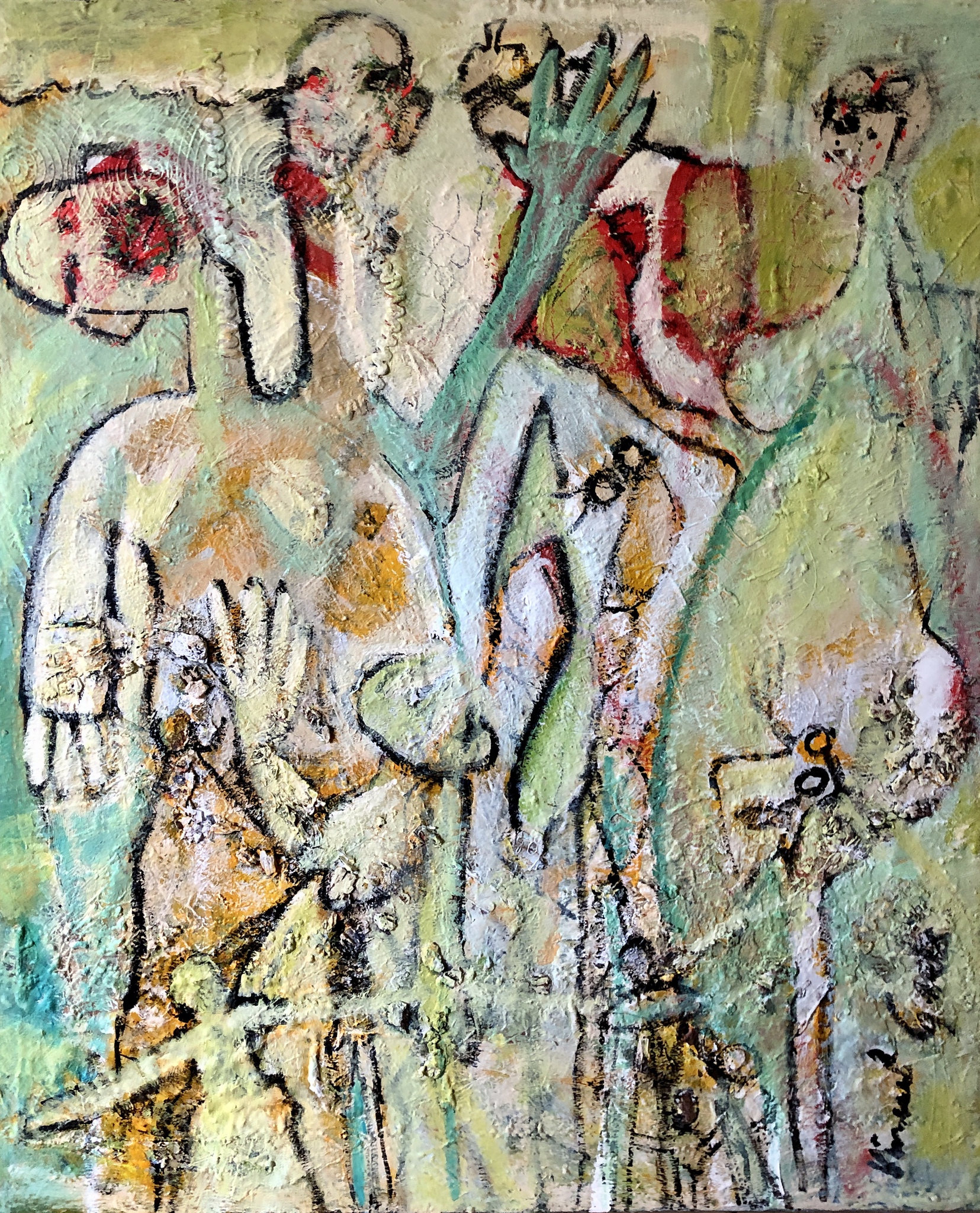 Vele figuren over het blad verdeeld. Grote handen kleine koppen.