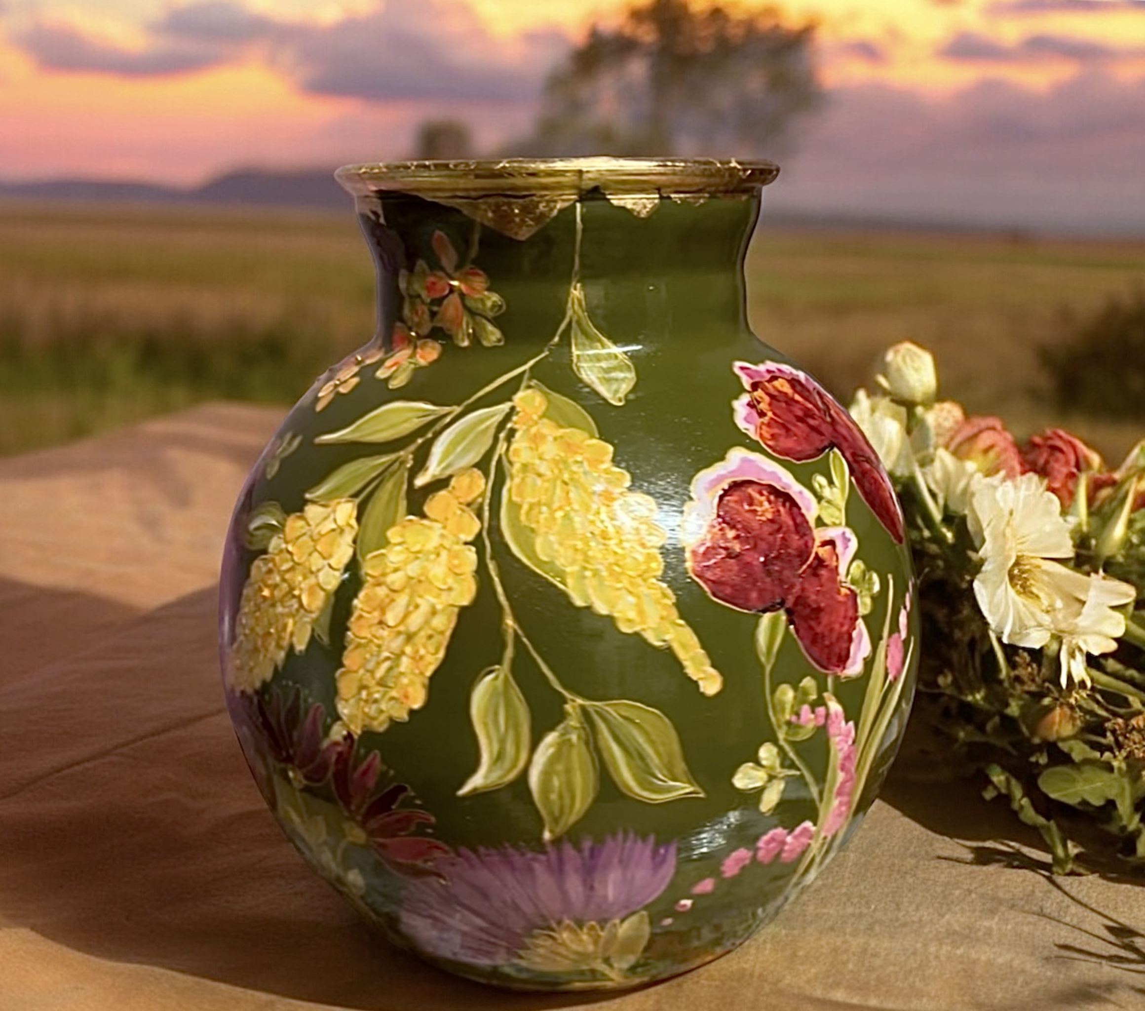 Handbeschilderde vaas in de kleur walnootbladgroen. Rondom beschilderd. Deze vaas komt te koop te staan bij bloemisterij Hartogs in Nuenen.