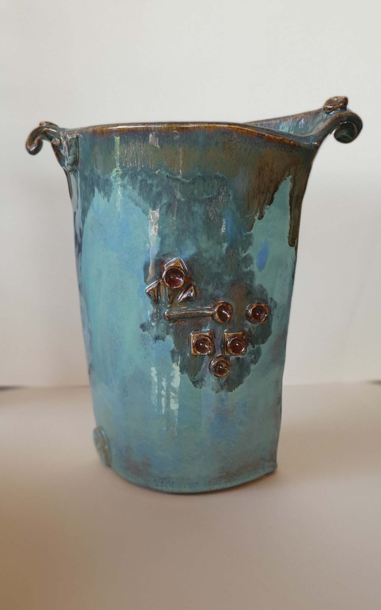 middelgrote vaas, steengoed, met plakken opgebouwd en opgewerkte accenten, kleur: goen/ blauw/ turquoise/ bruin, kan binnen en buiten