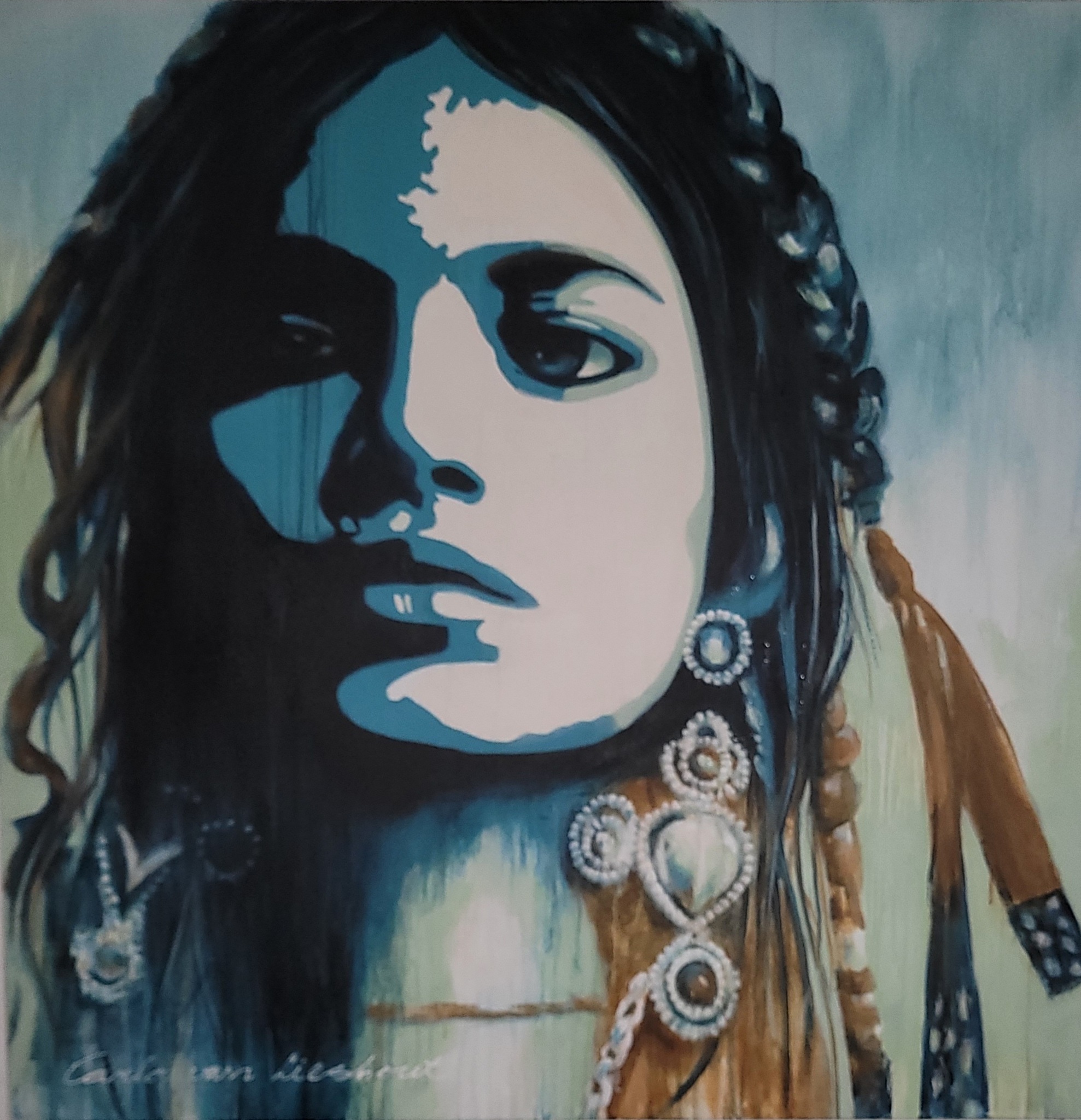Sfeervol aqua blauw portret Sfeervol groot schilderij. Geïnspireerd door de accessoires en vlechten . moderne portretkunst, een combinatie in de stijl van popart en figuratieve kunst. De sterke contrasten, het gebruik van kleurvlakken, en de focus op een grafisch en expressief portret , die ook in de popart worden gebruikt, terwijl het figuratieve aspect zich richt op de herkenbare weergave van het gezicht en de accessoires in combinatie met mijn eigen schriftuur . De blauwe tinten creëren een koele en mysterieuze sfeer.