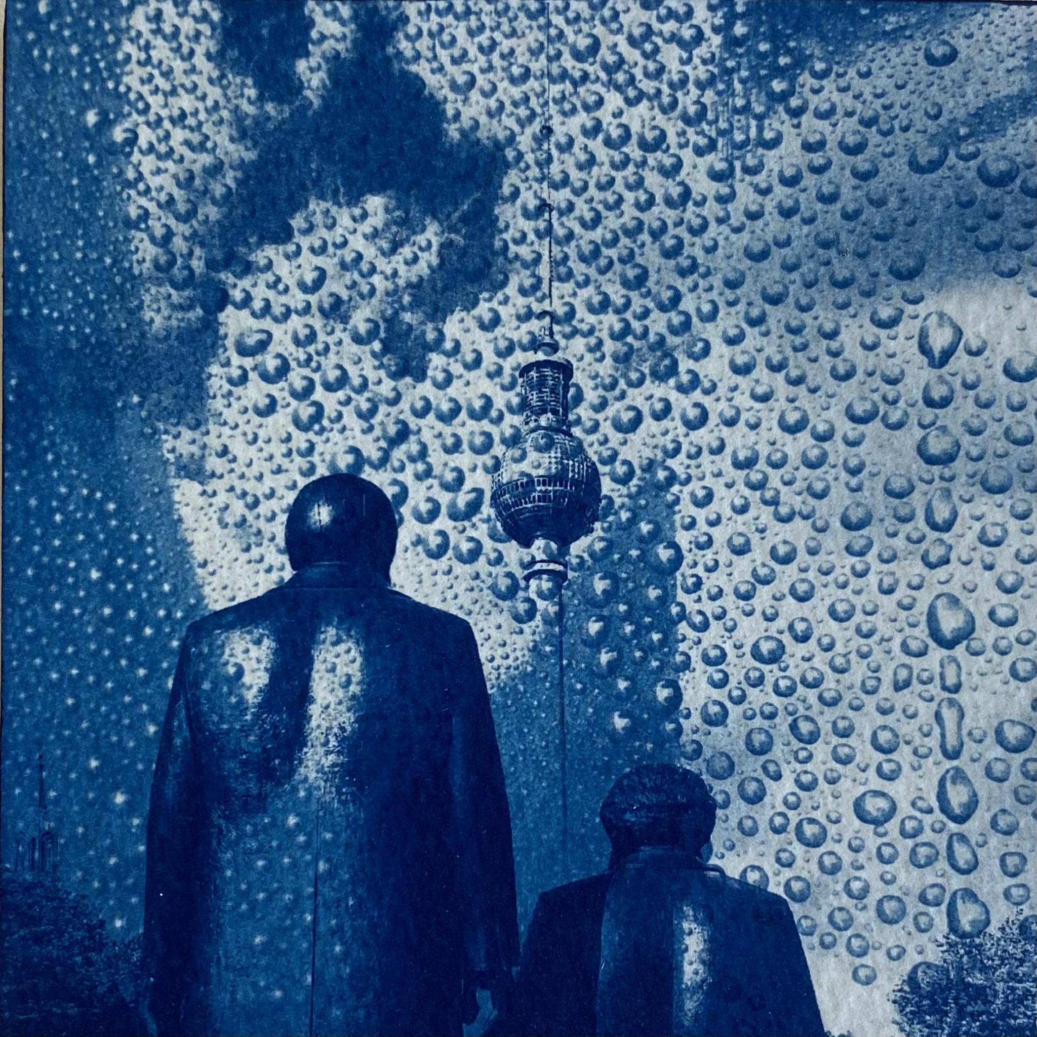 Uit de serie dubbel belichte fotogrammen van gecombineerde foto’s. Op 300 grams aquarelpapier, op een houten blokje van multiplex. Onder het motto: -geschiedenis draag je mee-versmelten Marx en Engels op de voor- of achtergrond met het heden. Blauwdruk oftewel cyanotypie is een van de oudste fotografische technieken uit omstreeks 1840. Het proces ontstaat bij het mengen van twee chemicaliën (Ammoniumijzercitraat en Kaliumhexacyanoferaat) Als deze twee stoffen worden blootgesteld aan zonlicht veranderen ze in Berlijns Blauw. Wanneer de chemicaliën zijn weggespoeld met water blijft er de kenmerkende blauwe kleur achter, waarop de afbeelding in witte lijnen is weergegeven.