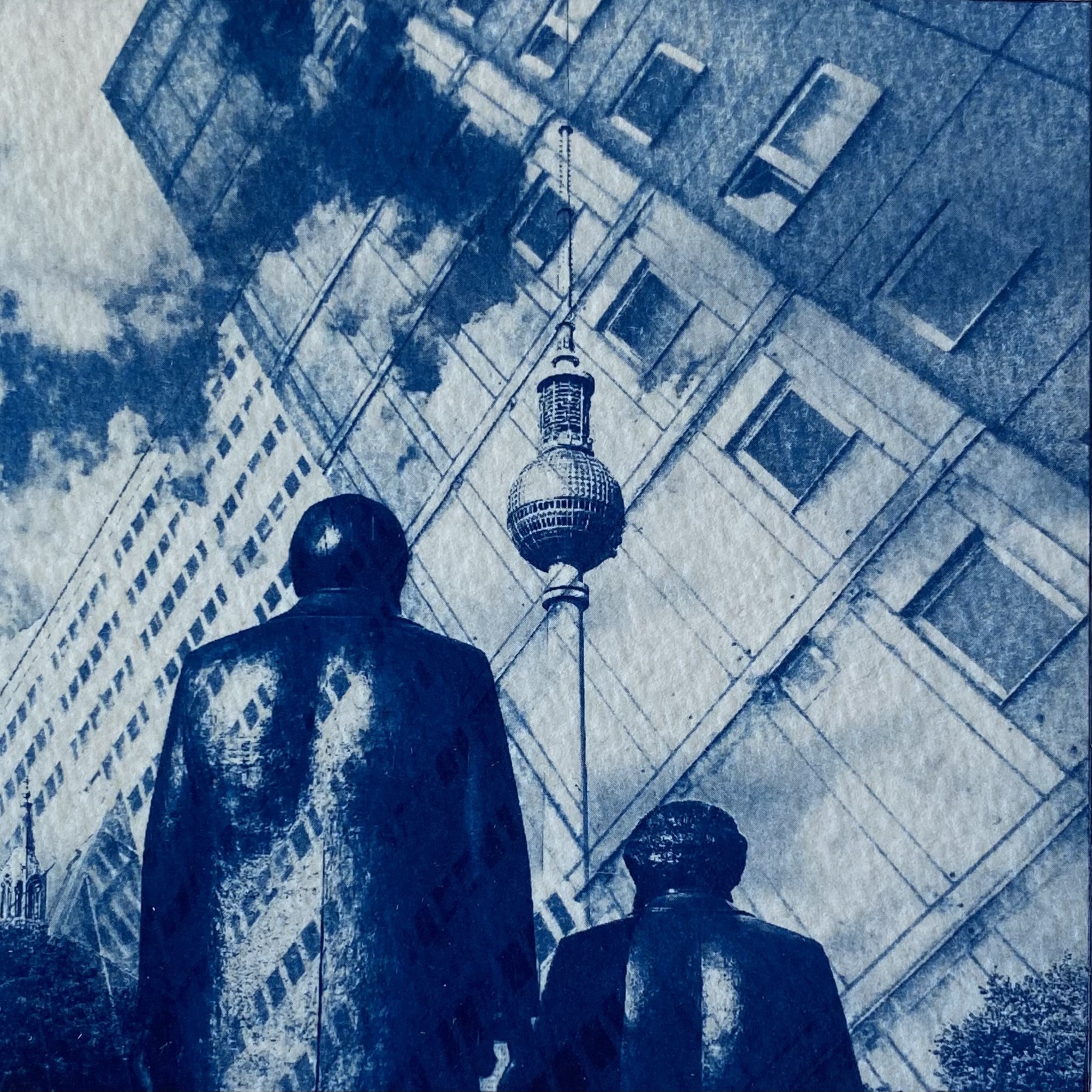 Uit de serie dubbel belichte fotogrammen van gecombineerde foto’s. Op 300 grams aquarelpapier, op een houten blokje van multiplex. Onder het motto: -geschiedenis draag je mee-versmelten Marx en Engels op de voor- of achtergrond met het heden. Blauwdruk oftewel cyanotypie is een van de oudste fotografische technieken uit omstreeks 1840. Het proces ontstaat bij het mengen van twee chemicaliën (Ammoniumijzercitraat en Kaliumhexacyanoferaat) Als deze twee stoffen worden blootgesteld aan zonlicht veranderen ze in Berlijns Blauw. Wanneer de chemicaliën zijn weggespoeld met water blijft er de kenmerkende blauwe kleur achter, waarop de afbeelding in witte lijnen is weergegeven.