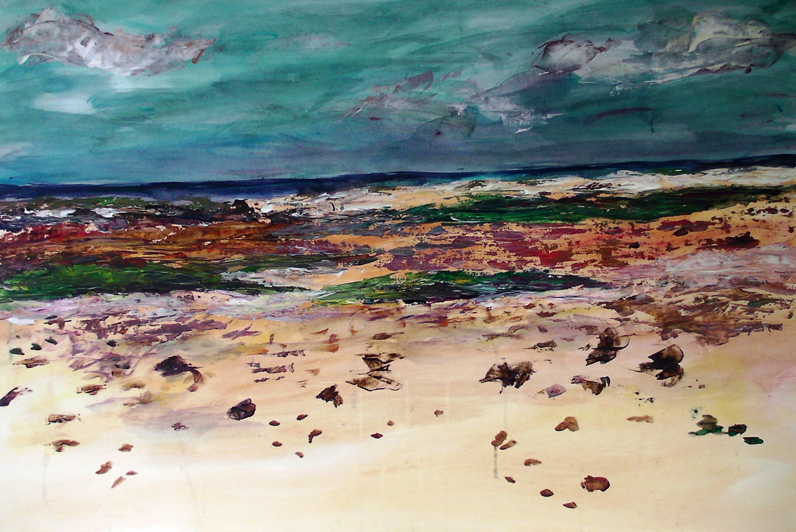 De rauwheid van de overgangen in de natuur, de donkere wolken tegen een getextureerde ondergrond. Over Bonaire onvergetelijk >> Meer werken uit de reeks "Bonaire onvergetelijk" deel van " Volle Leegten unieke werelden" >>