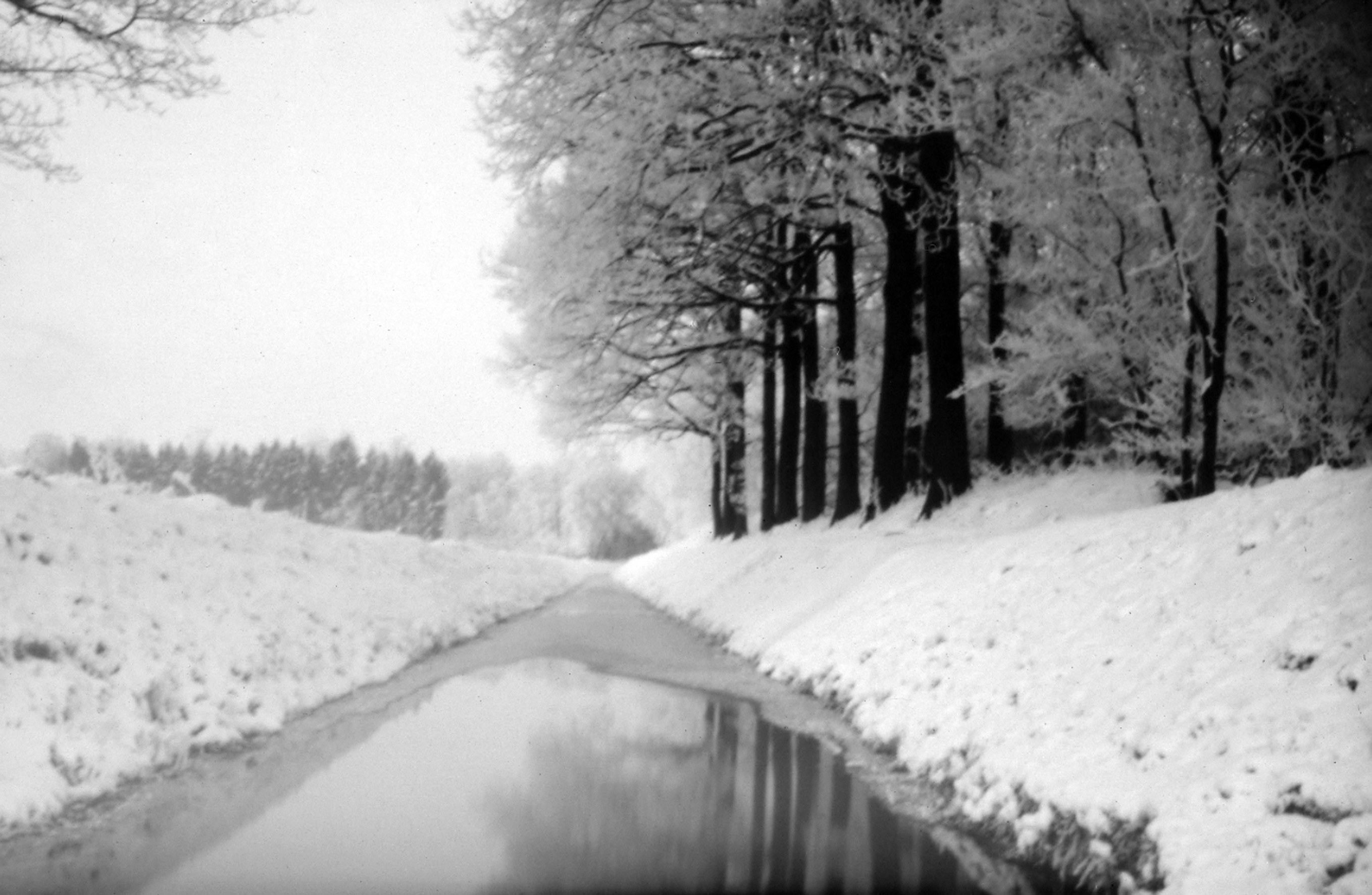 De waterleiding als een spiegel voor het intens witte sneeuwlandschap