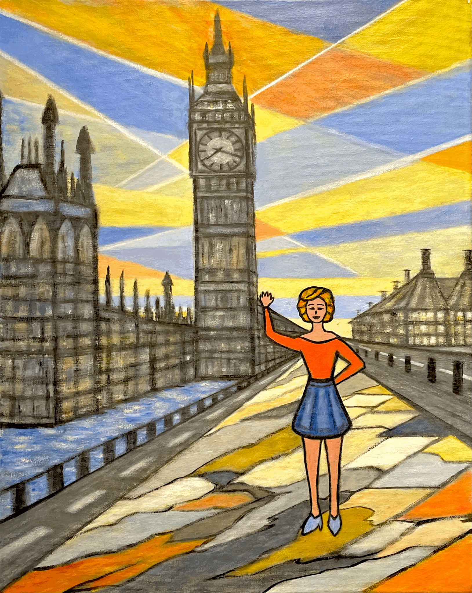 Het 2e werk in de serie modellen in wereldsteden: deze keer bij de Big Ben in Londen. Rustpunt in een hectische stad. Met het model centraal op de voorgrond, zowel letterlijk als figuurlijk.