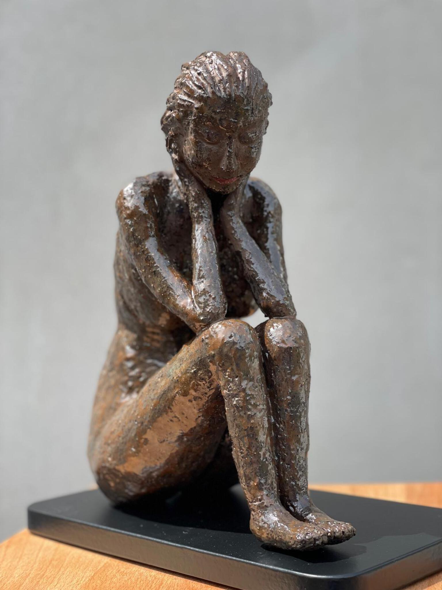 Thinking is gemaakt van grove chamotte klei, afgewerkt met glazuur.