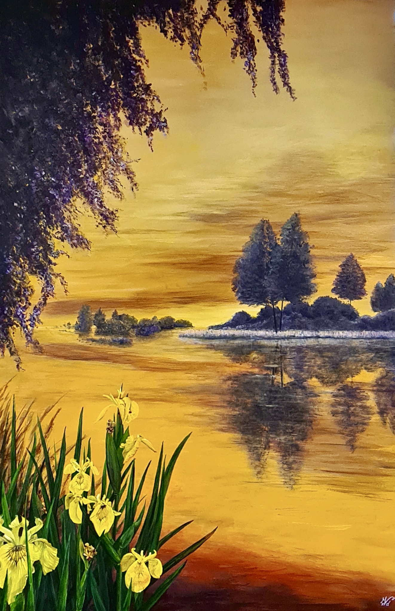 Rood Oranje Geel Landschap Paars Goud Groen Bloemen Zonsondergang Water Realistisch Bomen Lila Lisse Droomplek