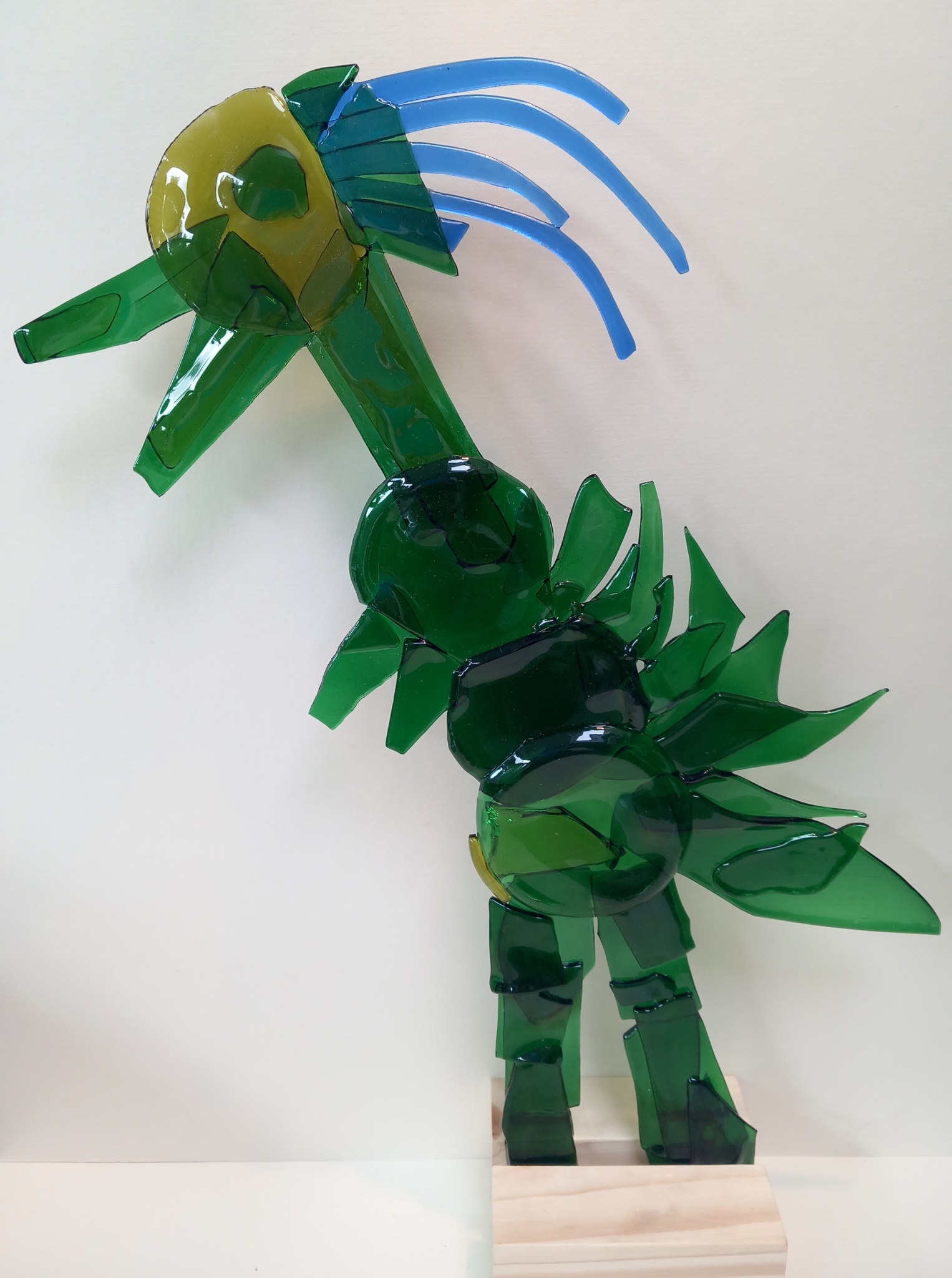 De fantasie blauwbilgorgel (zie verderop) had een gesprekspartner nodig. Het werd een groene, die boven hem uittorent, en met hem in gesprek gaat...Gerecycled glas. gemonteerd op houten blokje.