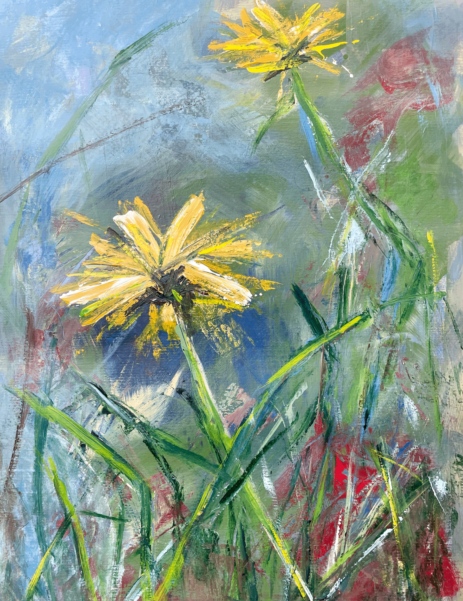 Fietsend naar het atelier, bloemen in de berm in het hoge gras, inspirerend.