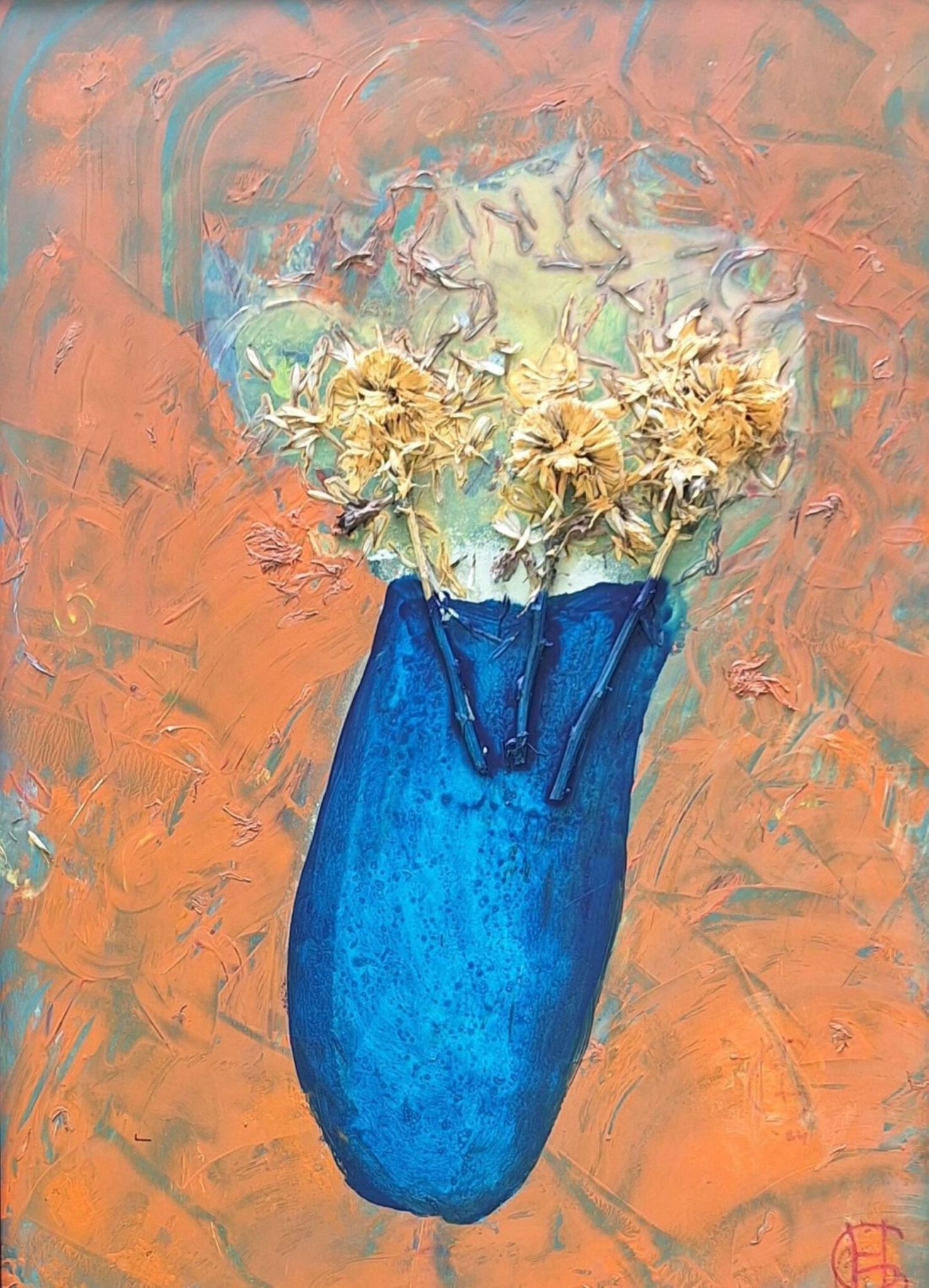 Schilderij Abstract Oranje Blauw Bloemen Vaas Mixed Media Van Natuur Gekleurd Hetty Gool