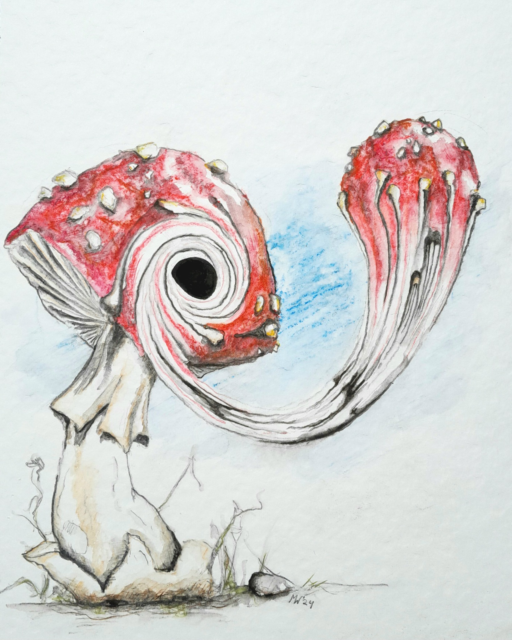 Een vliegenzwam wordt opgeslokt door een zwart gat in een andere vliegenzwam. Aquarelpotlood en water op 300 grams aquarelpapier.
