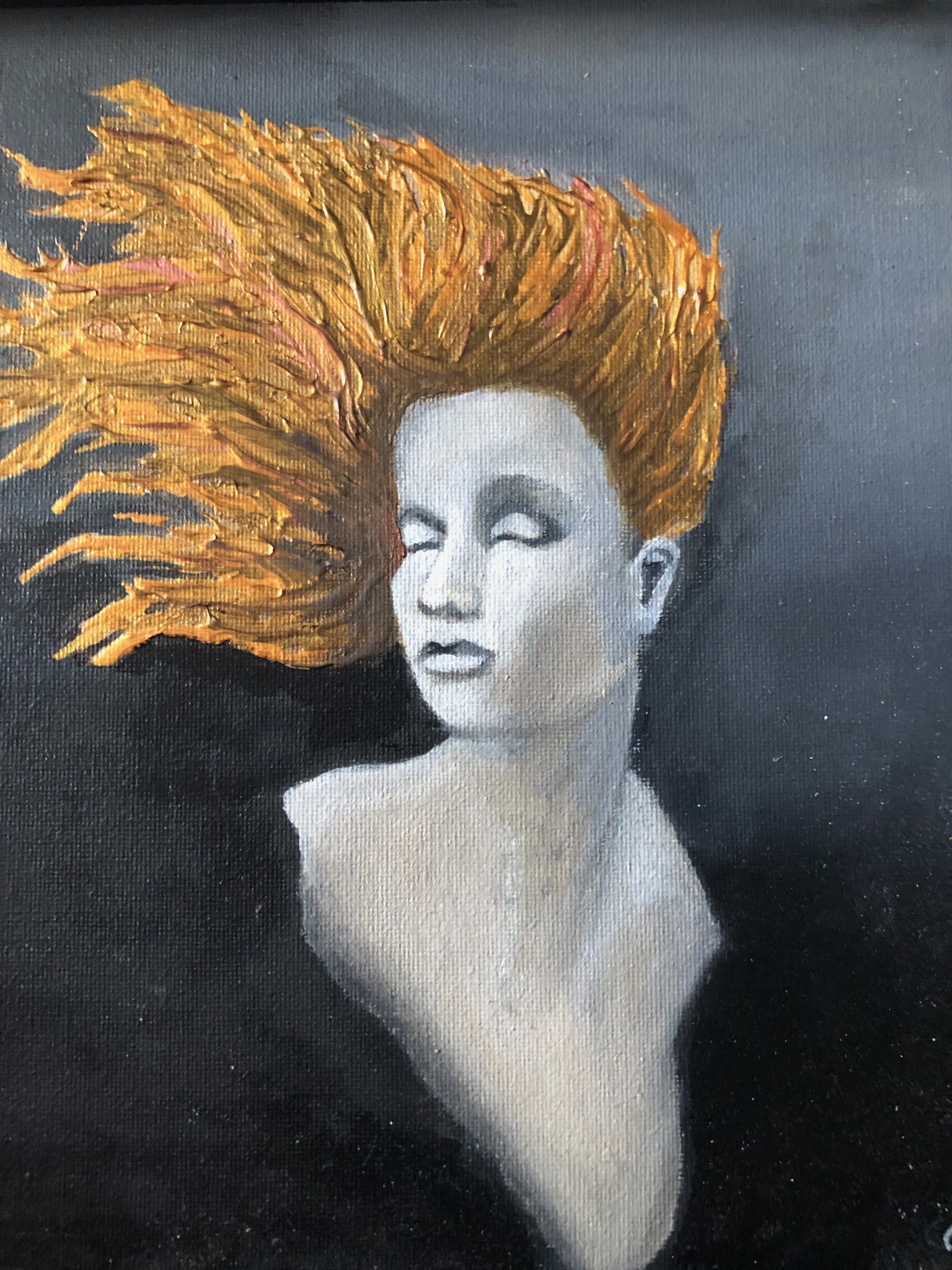 Witte vrouw met goud haar, zwarte achtergond en zwarte lijst