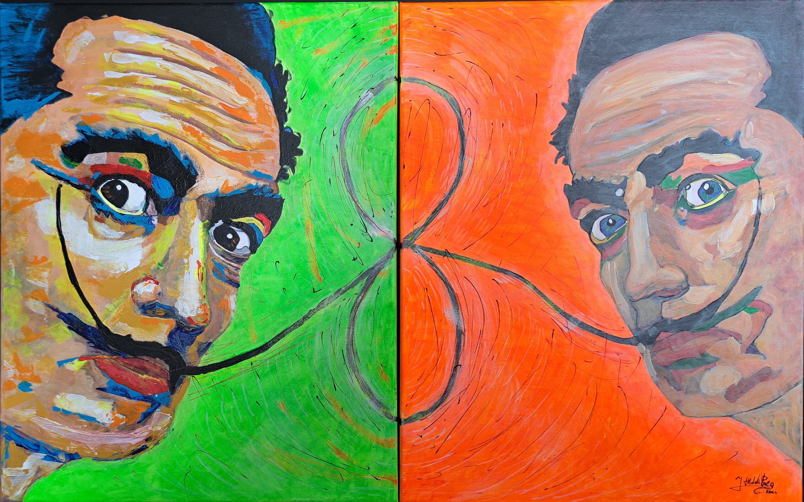 "Broeder liefde" de acryl neon kleuren geven met blauw licht een extra dimentie aan het doek.