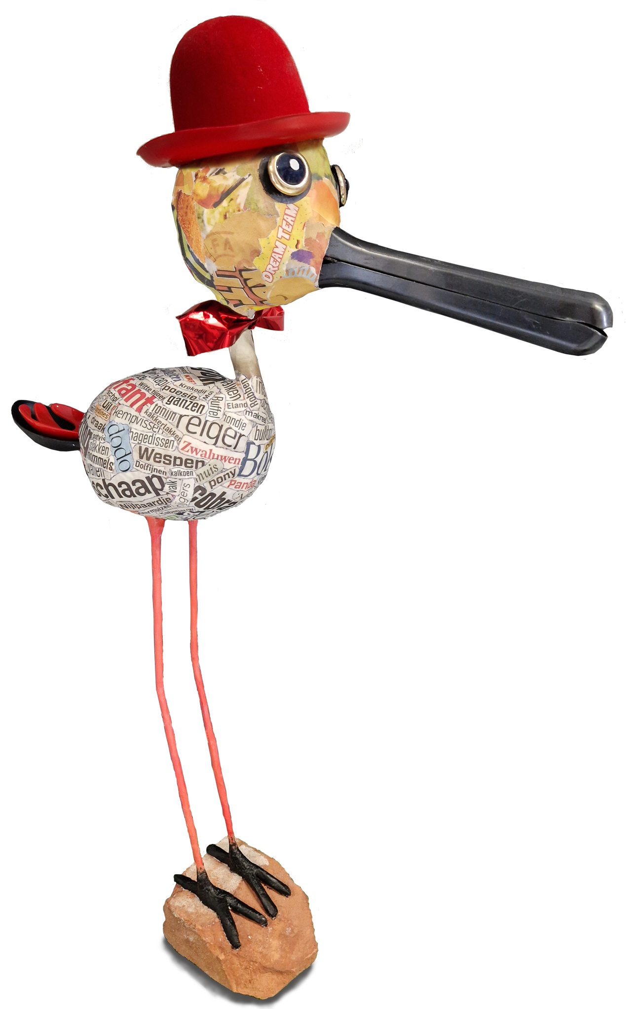 mijn naam is Fred Dessing en ik maak van rest-en afvalproducten én van papier-maché letterlijk heel vreemde vogels. puur uit hobby ben ik hier aan begonnen en heb inmiddels ruim 130 exemplaren vervaardigd en verkocht. ik sta regelmatig op kleine kunstmarkten, voornamelijk in de Randstad waar ik mijn vogels probeer te slijten. het zijn 3 dimensionale vogels, gemiddeld zo'n 70 cm hoog en alleen geschikt om binnenshuis te plaatsen, maar ik vervaardig nu ook exemplaren die bijvoorbeeld in de tuin geplaatst kunnen worden. hier ben ik mee gestopt omdat de combinatie papier-maché en de tegenwoordige natte omstandigheden buiten niet ideaal was