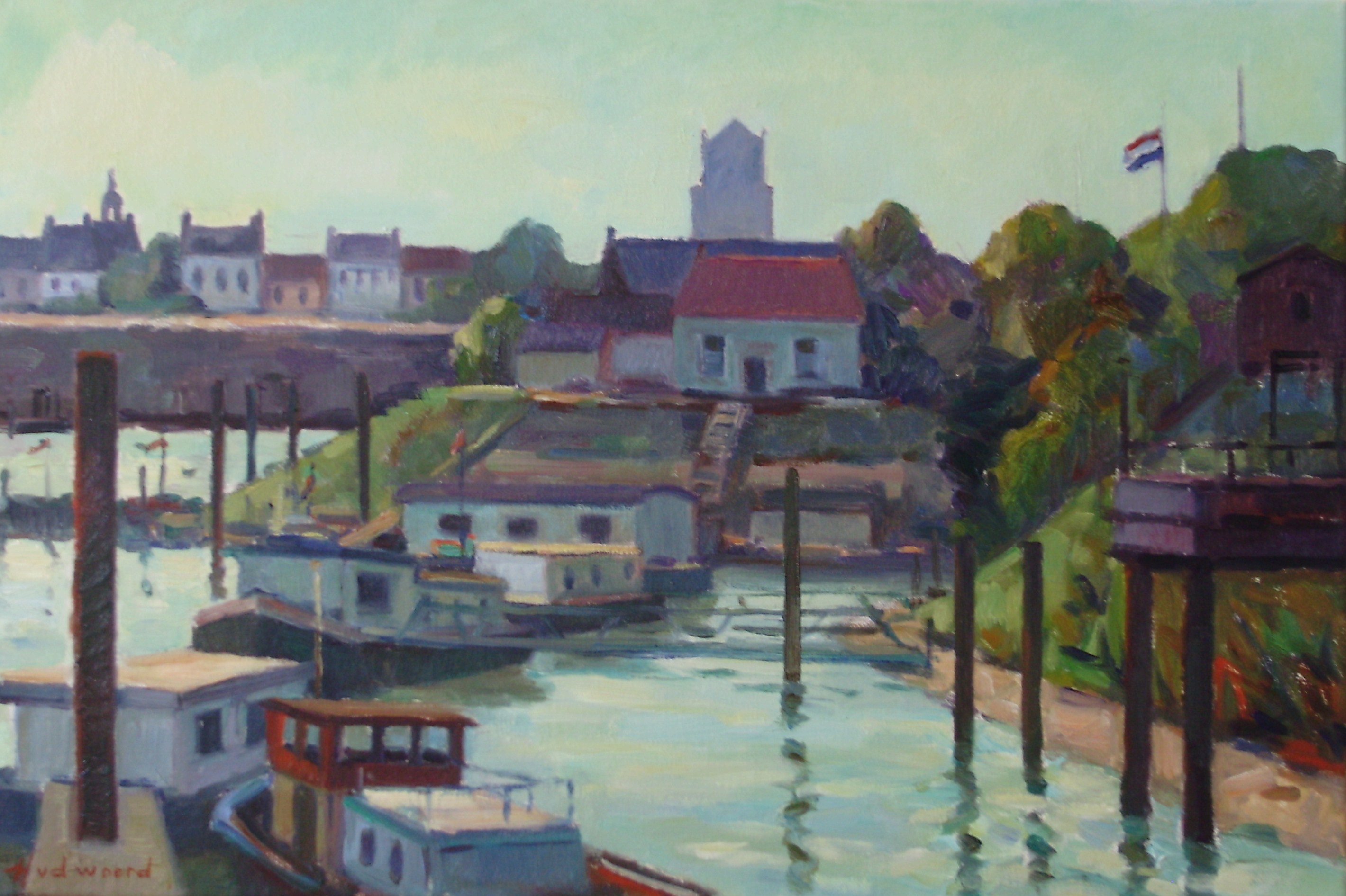 Ook kleine haventjes kunnen hun bekoring hebben. Dit schilderij is ook te huur, maar verkoop gaat boven huur.