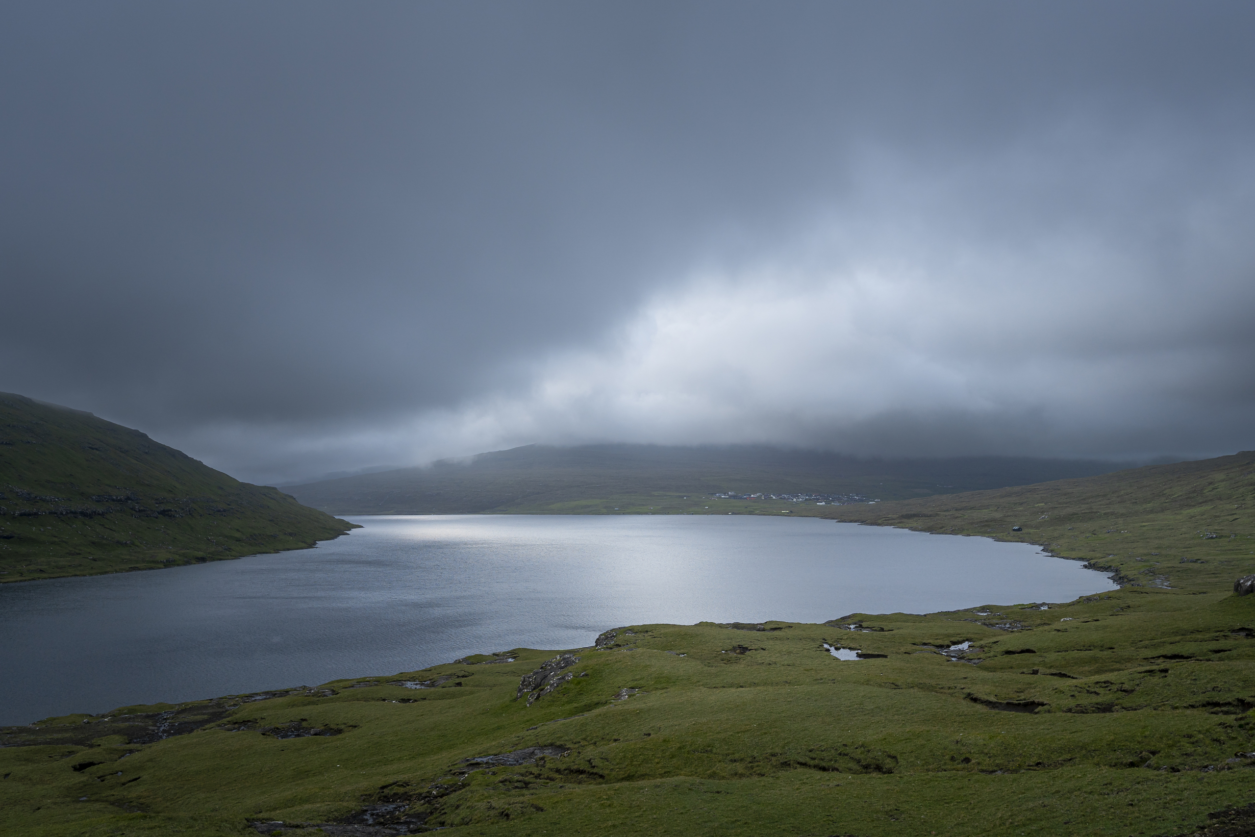 Lichtval boven het meer bij Sandavagur, Faeröer eilanden