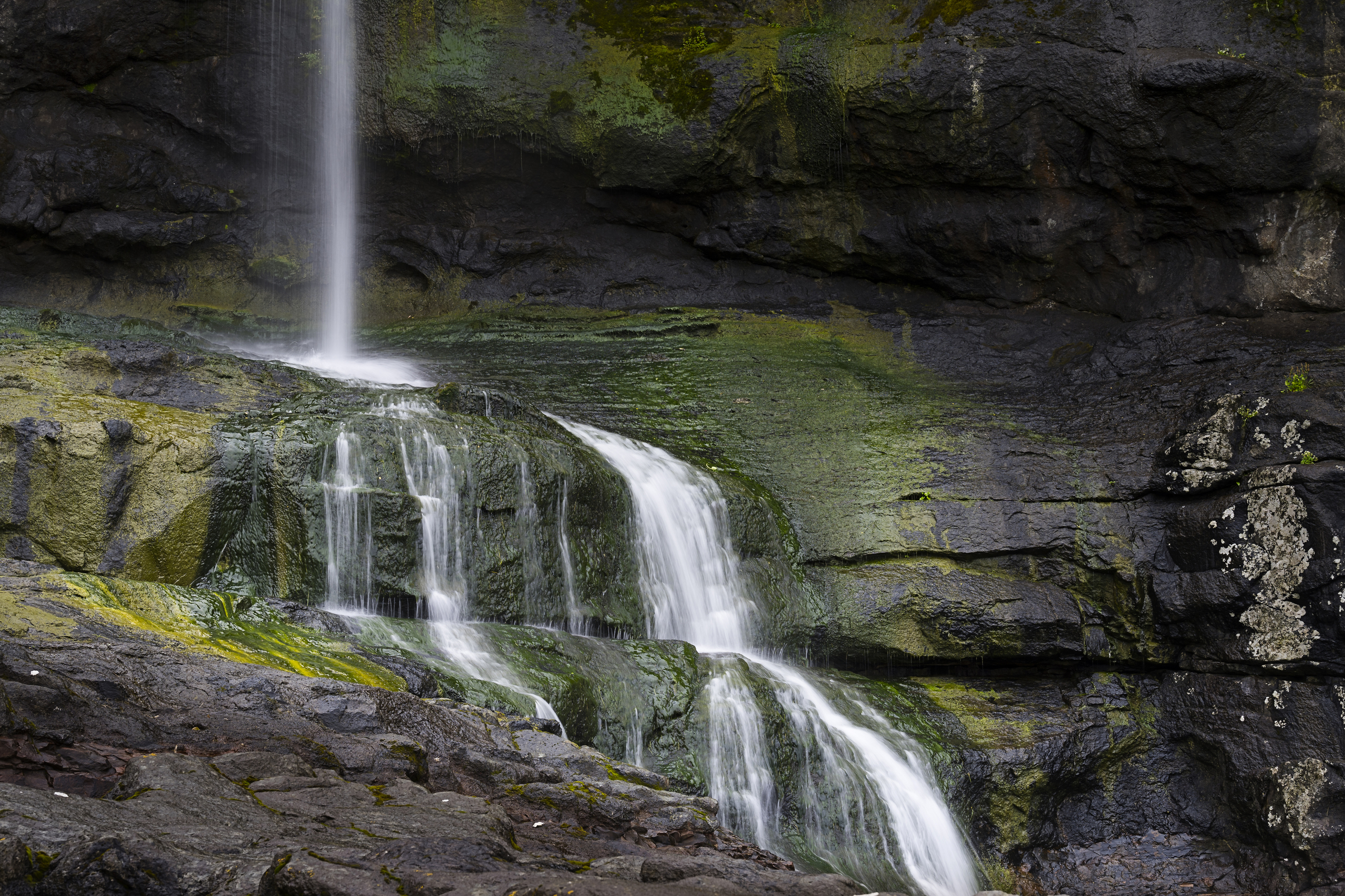 Waterval op groene rotsen bij Bour, Faeröer eilanden