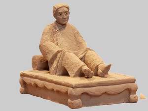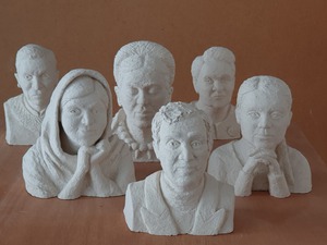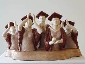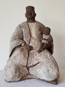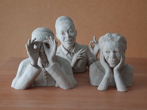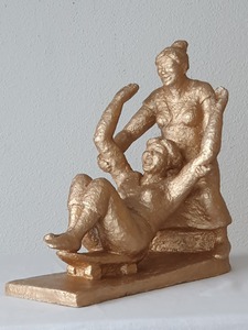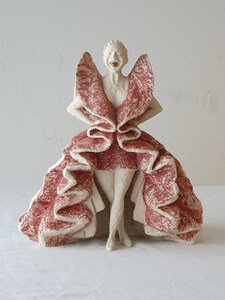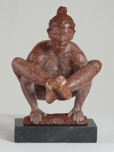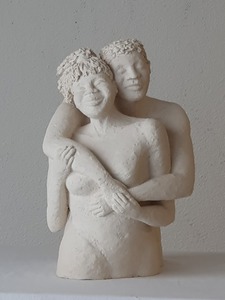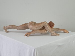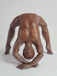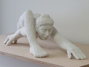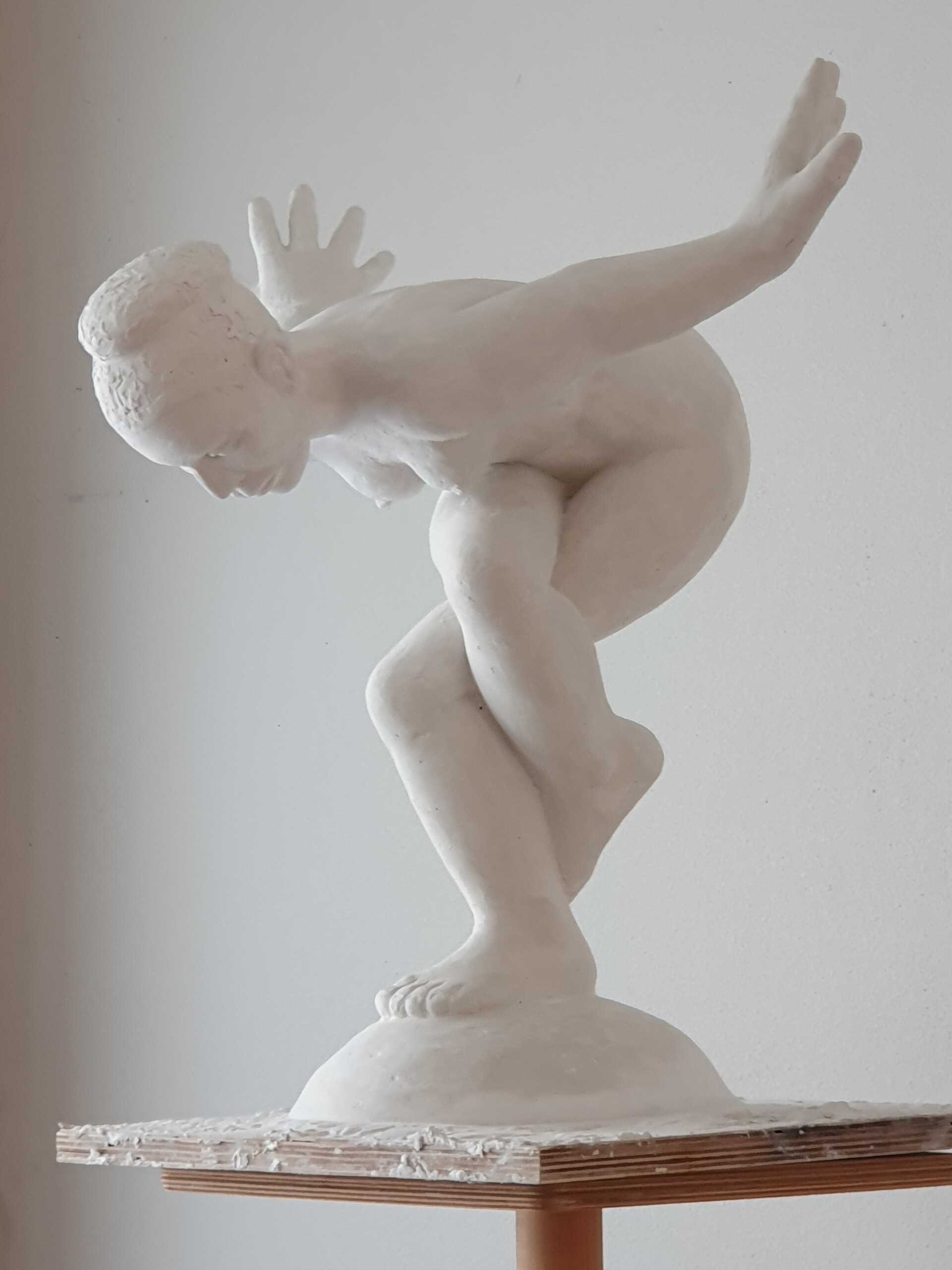 De figuur Awa lijkt in de ruimte te zweven. Haar naar voren gebogen houding, met armen uitgestrekt als vleugels, roept de majesteit en vrijheid van een adelaar in vlucht op. Wat zie je als je net als een adelaar hoog boven de aarde zweeft, vlieg je weg of duik je naar beneden? Onbehandeld gips.