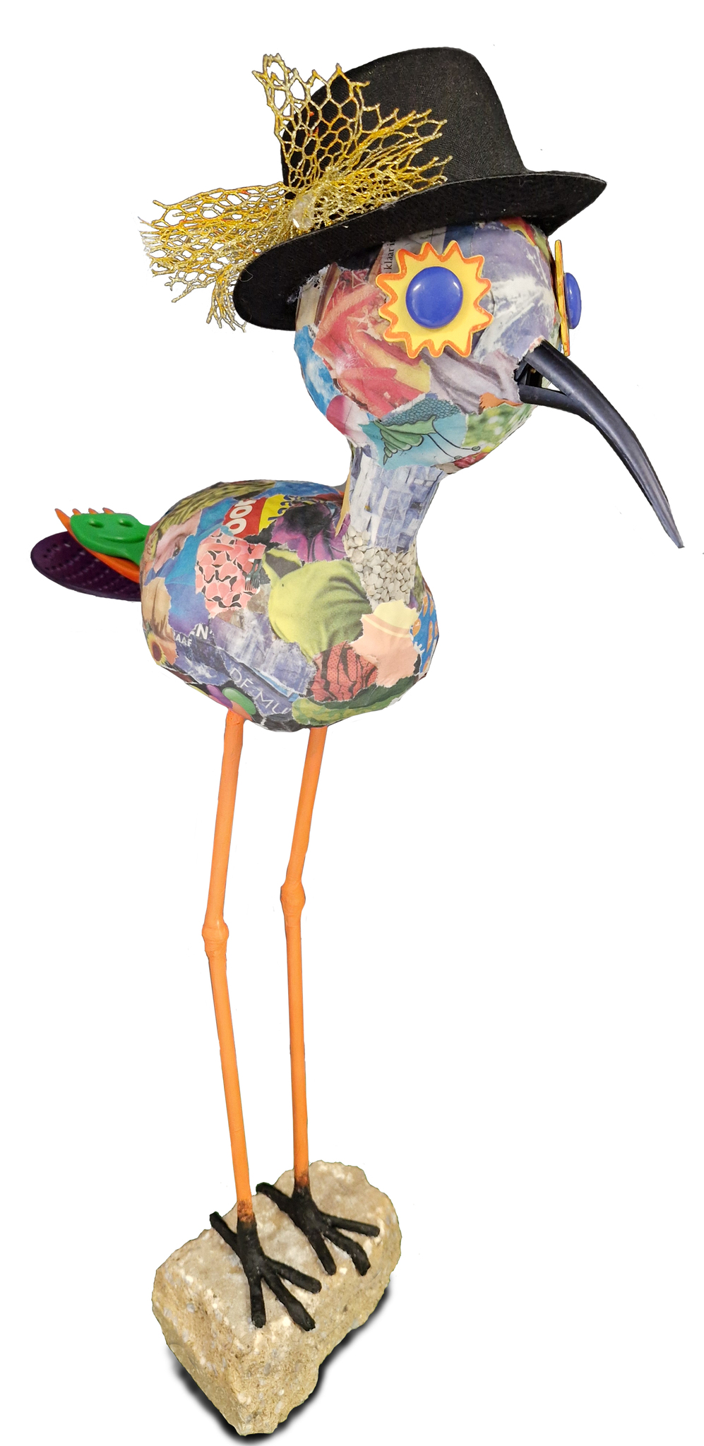 vogel van papie-maché beplakt met gekleurde krantensnippers