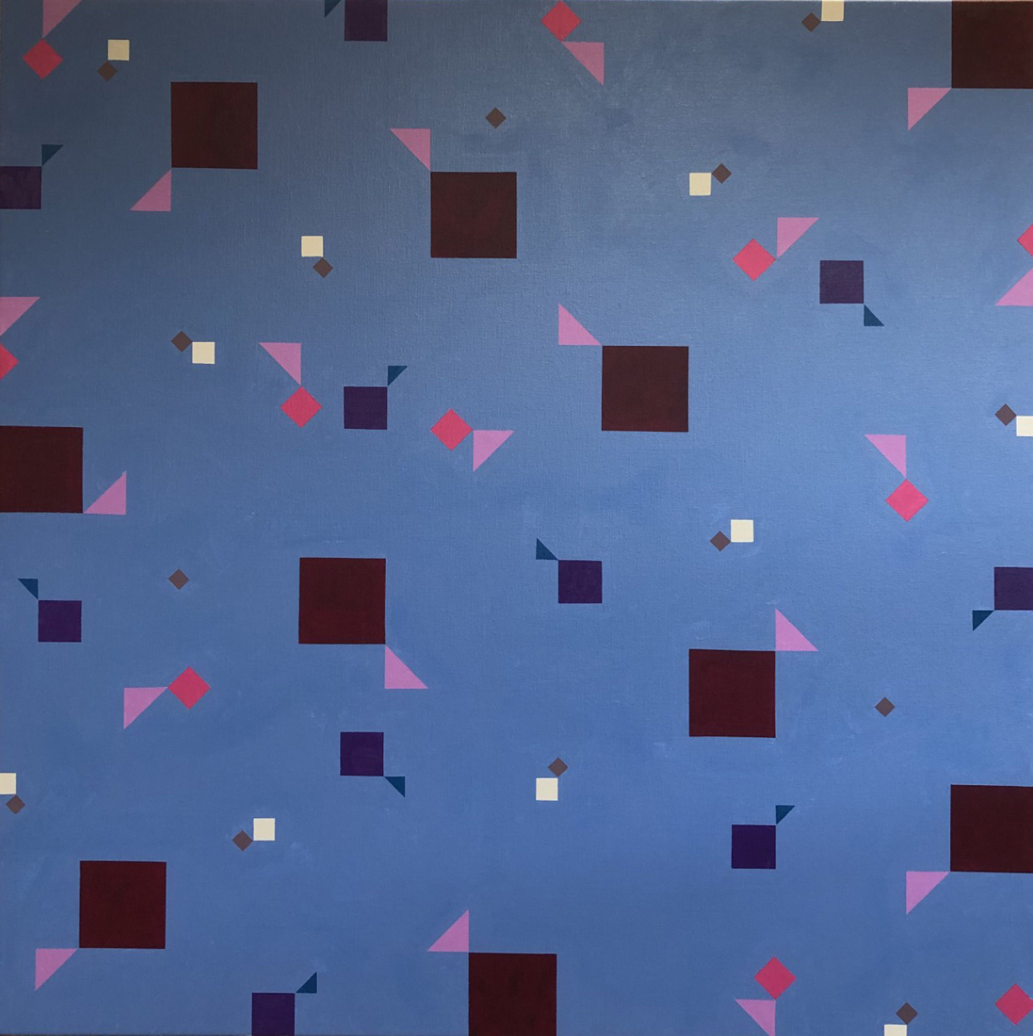 Thema: Chaos (Geometrische Chaos) Mijn kunst is beïnvloedt door de moderne wiskundige en wetenschappelijke benadering van het begrip complexe orde van de natuur. Met name heb ik me verdiept in de Chaos theorie en de fractal geometrie. Ik ben geen wiskundige, en ik gebruik geen wiskundige formules. De ideeën van de Chaos theorie en fractal geometrie leiden tot de ontwikkeling van de composities in mijn werk. Ik gebruik driehoeken,vierkanten en cirkels in mijn schilderijen, maar in mijn huidige serie, geoChao richt ik me alleen op de vierkanten en de verhoudingen tussen de vierkanten. Ik ontwikkel mijn composities door kleine vierkantjes op grote te zetten of grote op kleine te zetten. Het gaat om de onderlinge verhoudingen tussen de vierkanten. Ik laat de methode die ik kies de compositi
